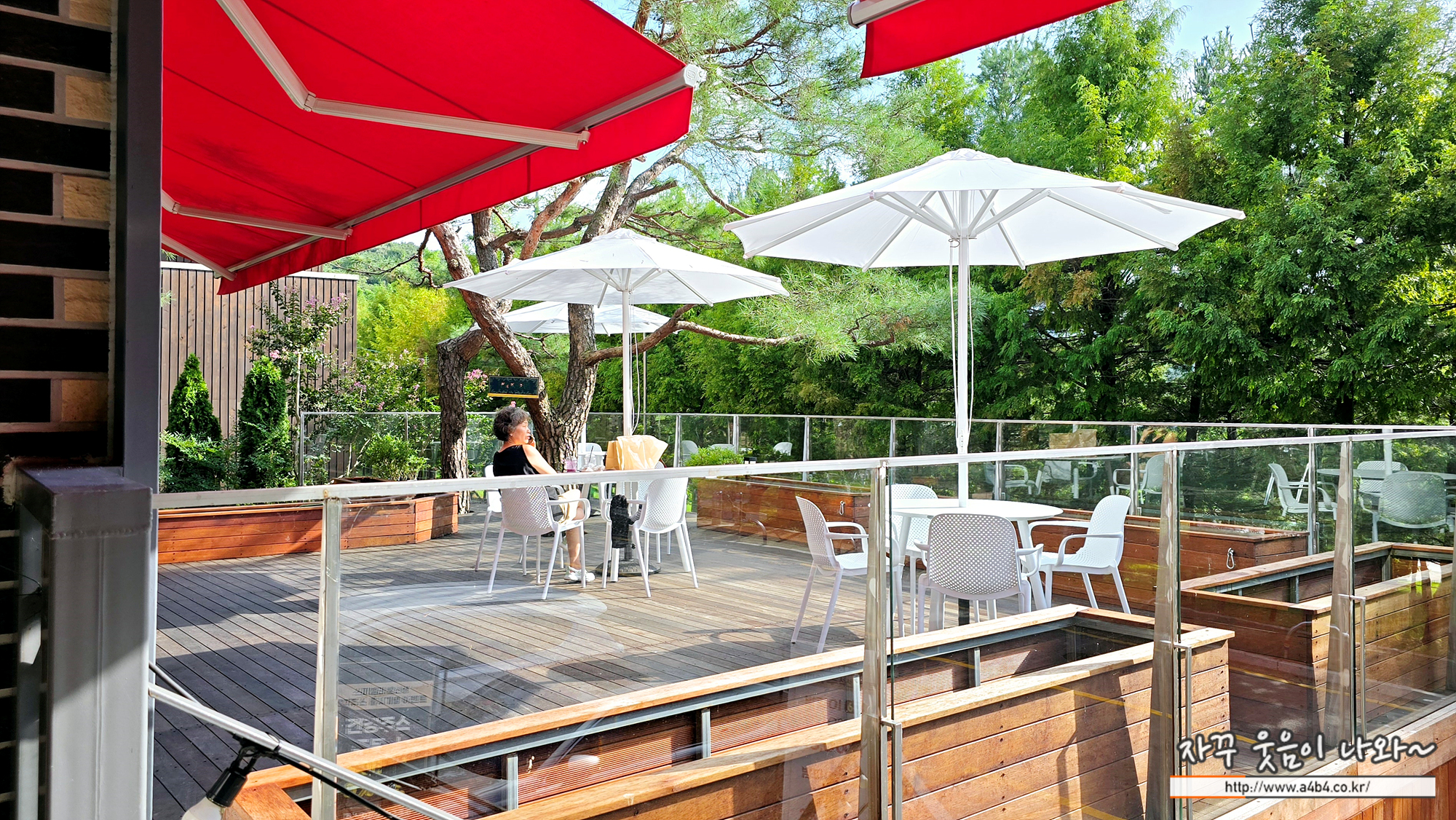 분당 카페빵선생 율동공원점 1층에는 야외 테라스가 곳곳에 준비되어 있습니다. 봄이나 가을에는 바람 맞으며 커피 한 잔하기 좋을 것 같은데요. 저희는 추석 연휴기간에 방문했는데요. 날씨가 너무 더워서 실내 이용 했습니다.