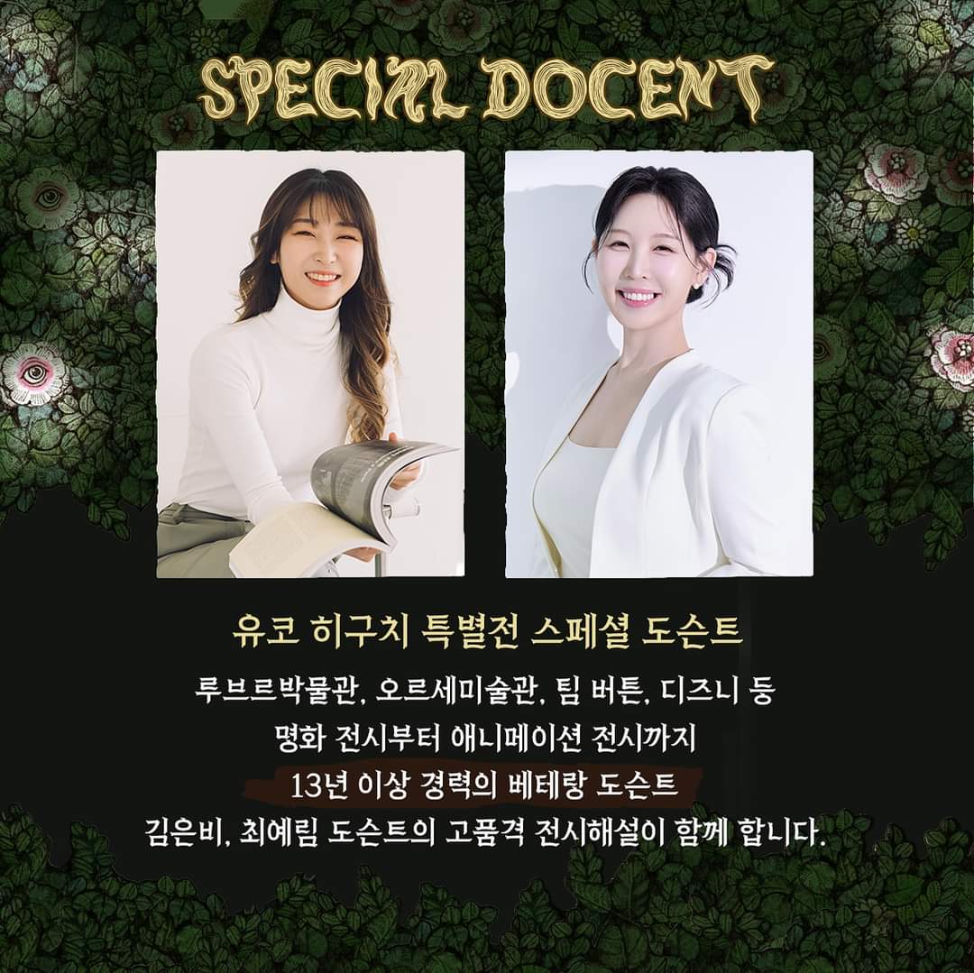 유코 히구치 특별전 도슨트는 10월 11일 (금)부터 운영됩니다. 개막일인 이번주와 다음주 까지는 사실상 도슨트 운영이 없다고 보시면 됩니다.