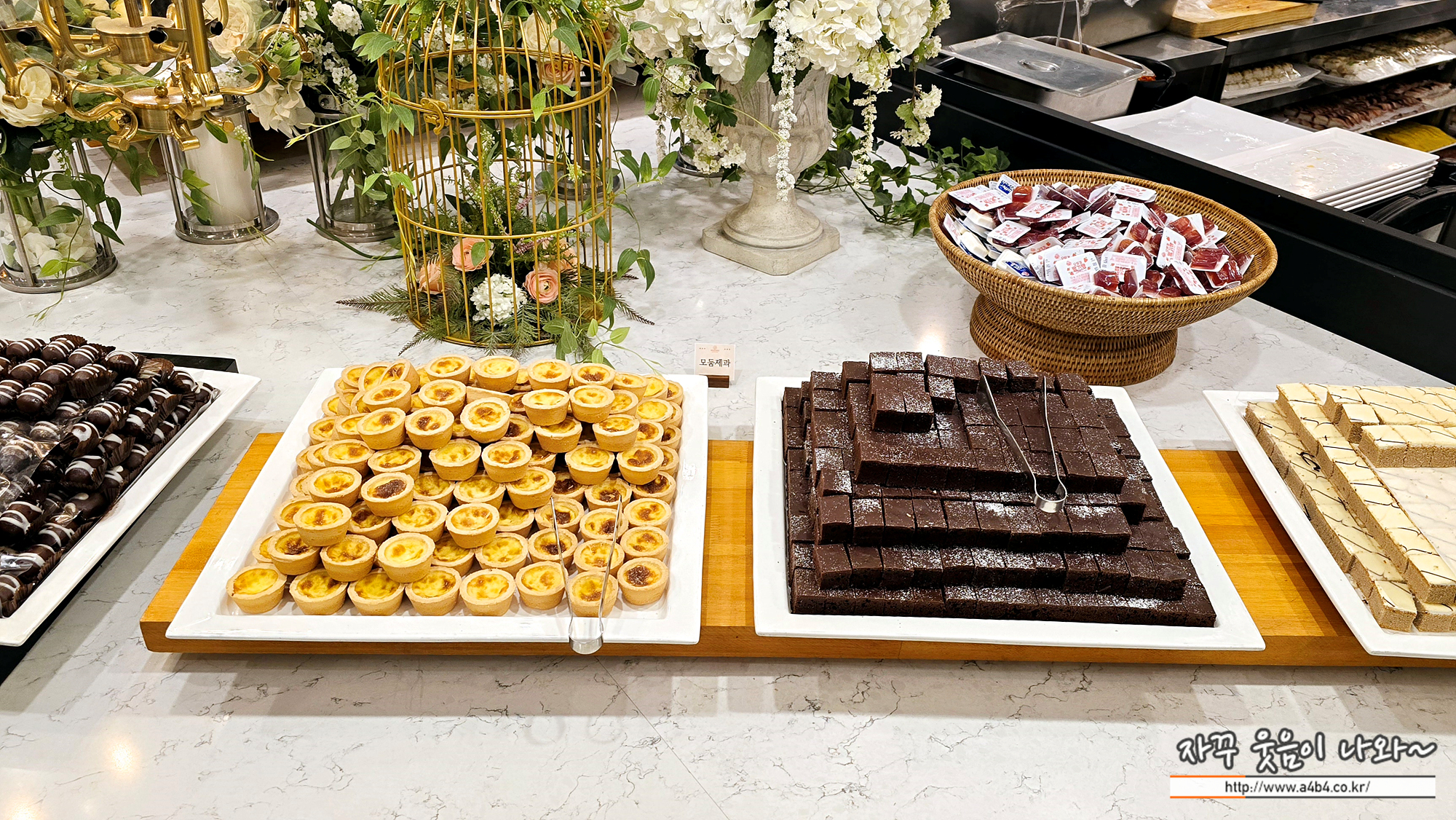 디저트는 사진과 같이 조각케익과 짝퉁 마카롱, 빵 일부와 떡이 준비되어 있네요.
