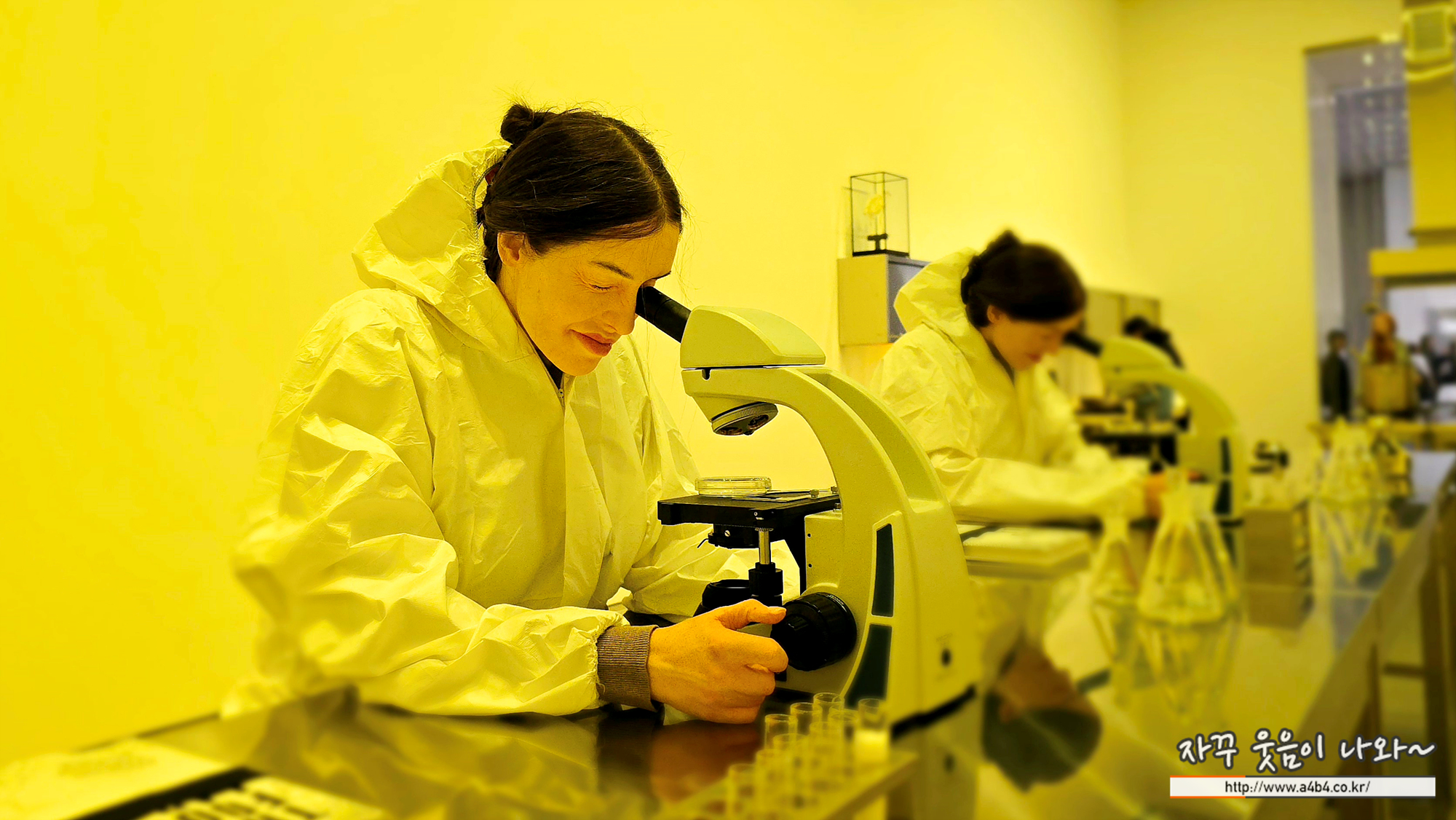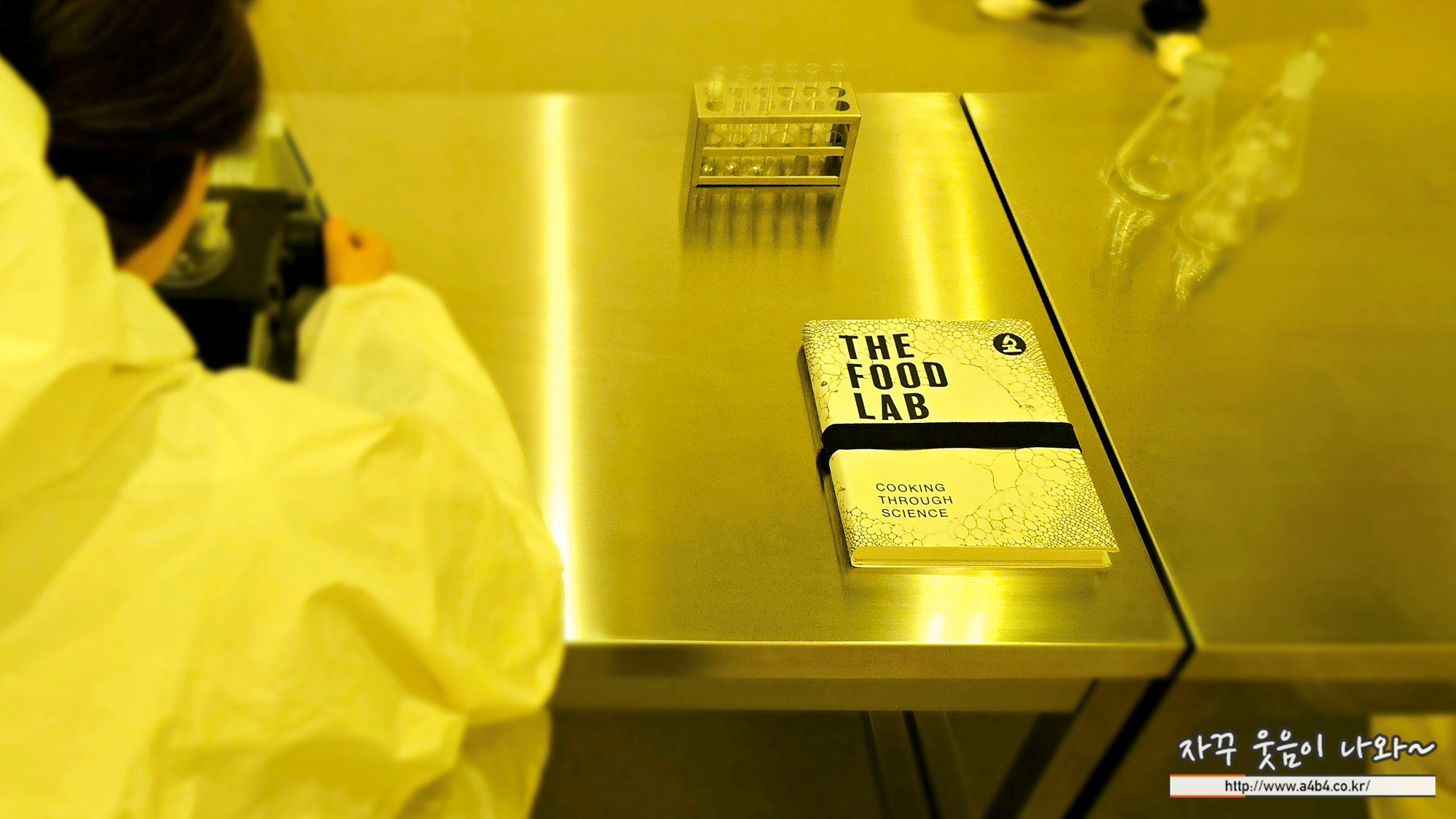 하얀 옷을 입고 있는 이 동일한 형상의 인물들은 현미경이 암시하는 것처럼 과학자인지, 혹은 흰 옷과 환경이 의미하는 것처럼 요리사인지 분간하기 어렵다. 주변의 스테인리스 가구는 실험실에 어울릴 법하지만, 그 환경은 분명히 산업용 주방임을 가스레인지, 냄비와 팬, 쌓인 식기들이 증명한다.