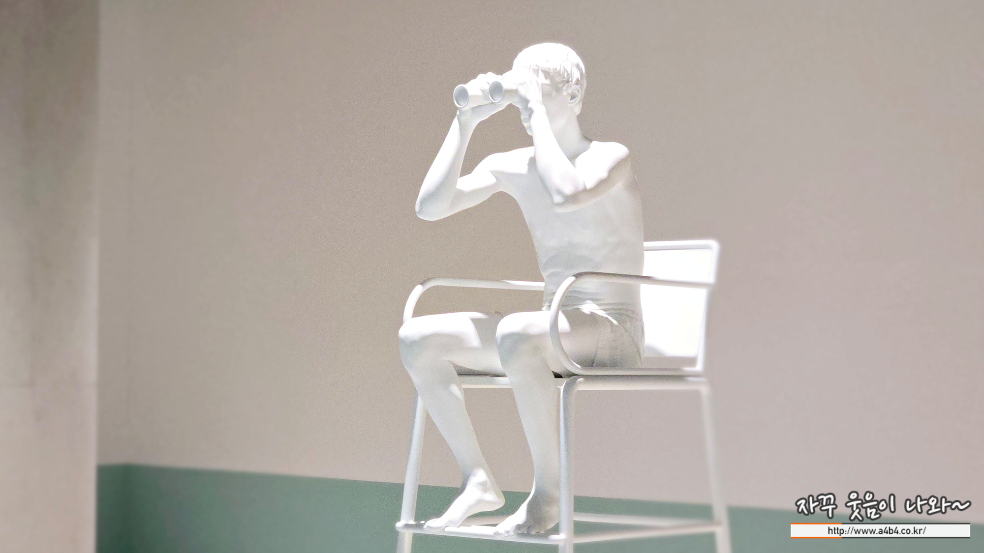 수영장 전체를 조망하는 자리에 앉아 망원경을 통해 무언가를 응시하는 젊은 남성을 묘사한 작품이다. 듀오의 설치 작품에서 흔히 볼 수 있듯이, 어떤 일이 갓 일어난 것인지 아니면 일어날 참인지는 불분명하다.