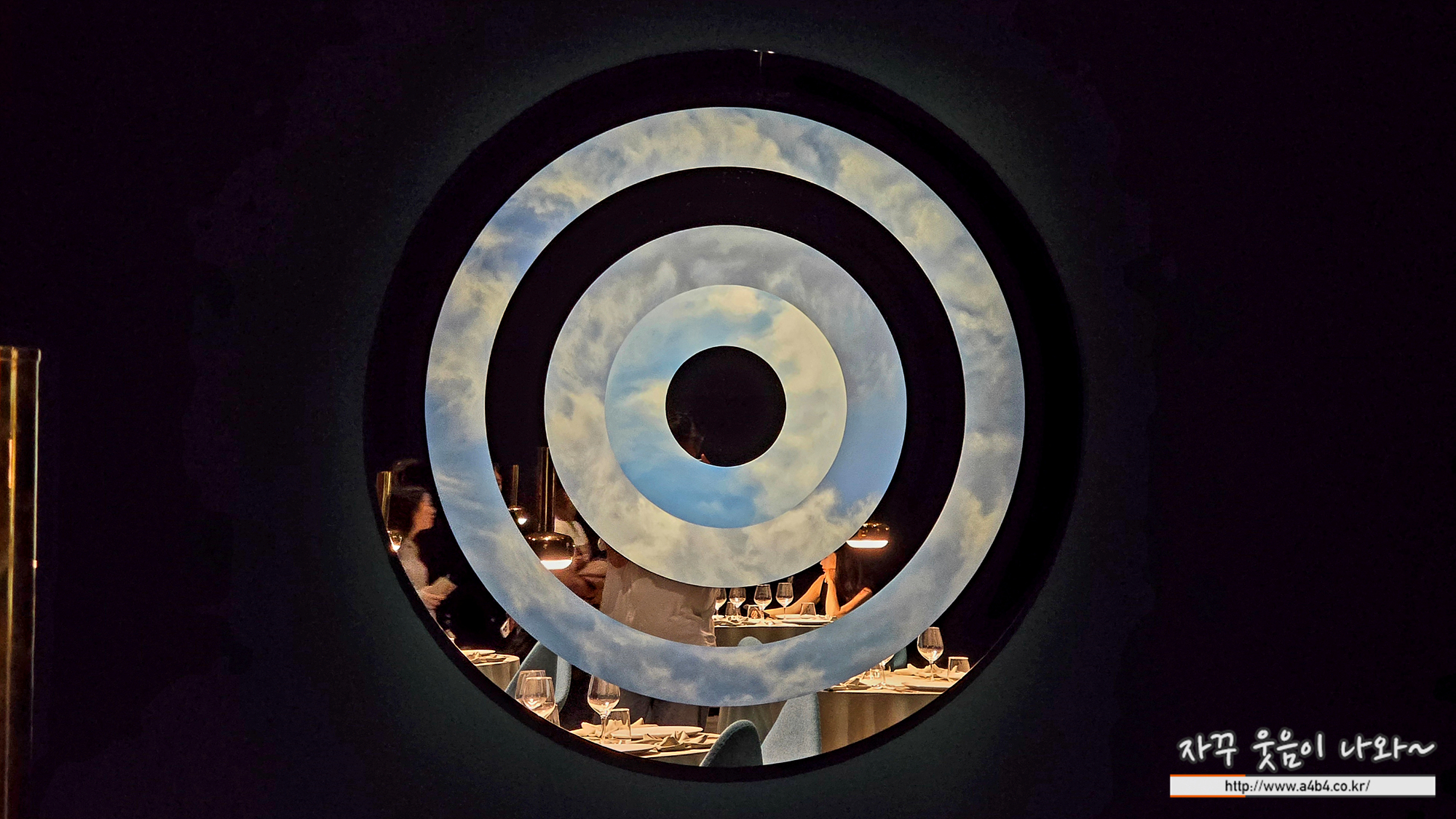 여성의 배경으로는 과녁을 닮은 작품들이 레스토랑의 벽을 장식한다. 다양한 구름 패턴을 지닌 하늘과 거울이 조합된 작품으로, 관람객은 각도에 따라 반사된 공간을 바라보게 된다. 각 작품은 부산, 교토, 상해의 하늘을 촬영한 후 유채로 스테인리스 스틸 위에 그려졌다. 하늘은 줄곧 인간의 상상력과 신화를 자극해왔다.