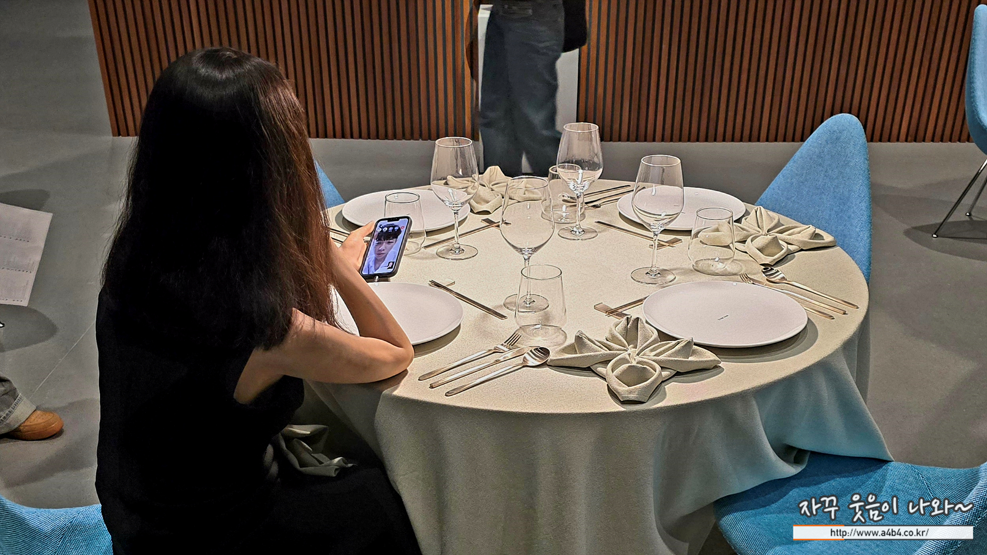 식사 공간으로 들어서면 극사실적으로 묘사된 여성 조각이 레스토랑 테이블에 홀로 앉아 영상 통화에 깊이 몰두하고 있다. 그녀가 대화하는 가상의 친구는 최근 실패한 연애에 대해 독백을 이어간다.
