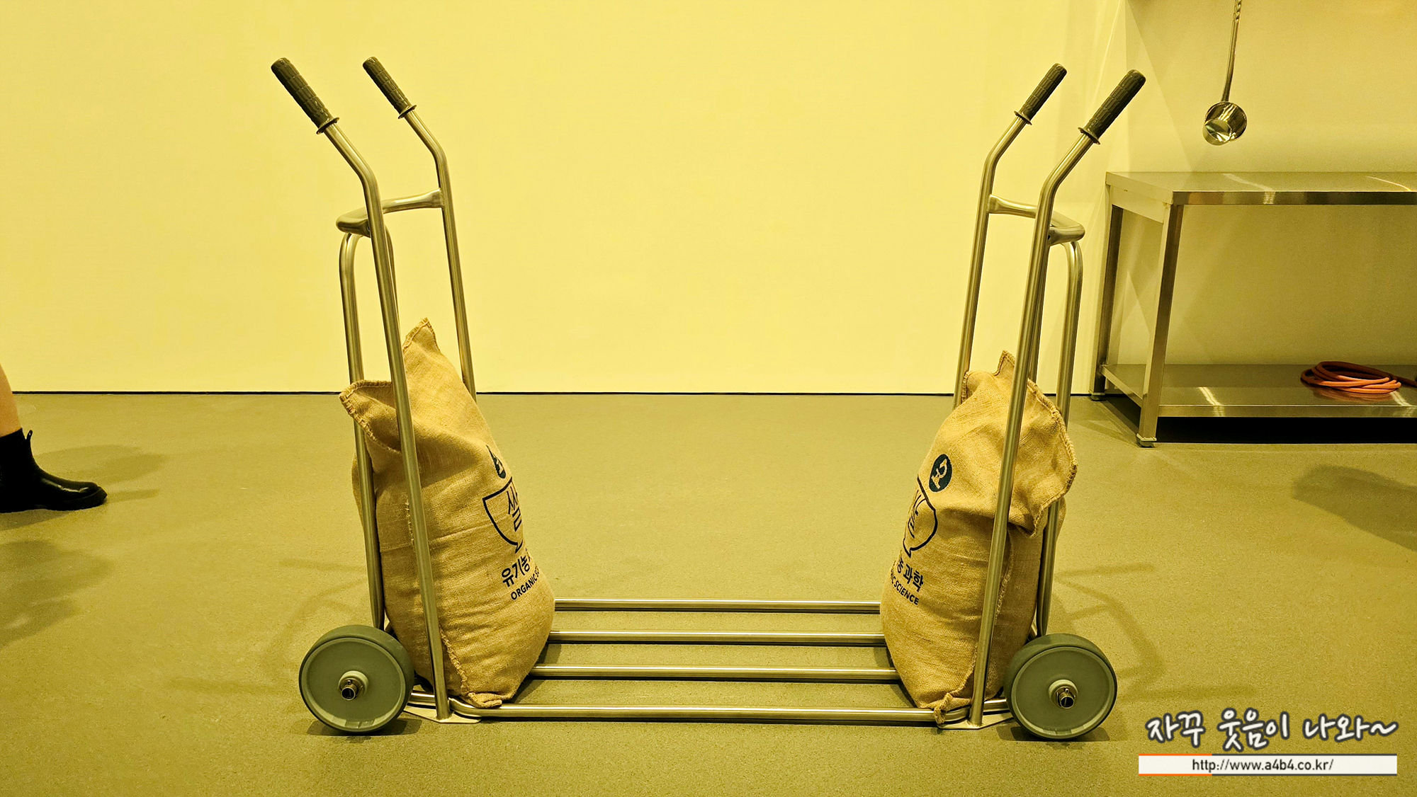 두 인물 주변으로는 서로 마주 보는 두 개의 손잡이를 가진 하나의 철재 카트가 놓여있다. 카트의 하단 선반은 융합되어 사용이 불가능한 상태이다. 이 이중 카트는 작업대에 마주보고 있는 동일한 인물들과 비견되어 기괴한 거울 같은 미장센을 창출한다.
