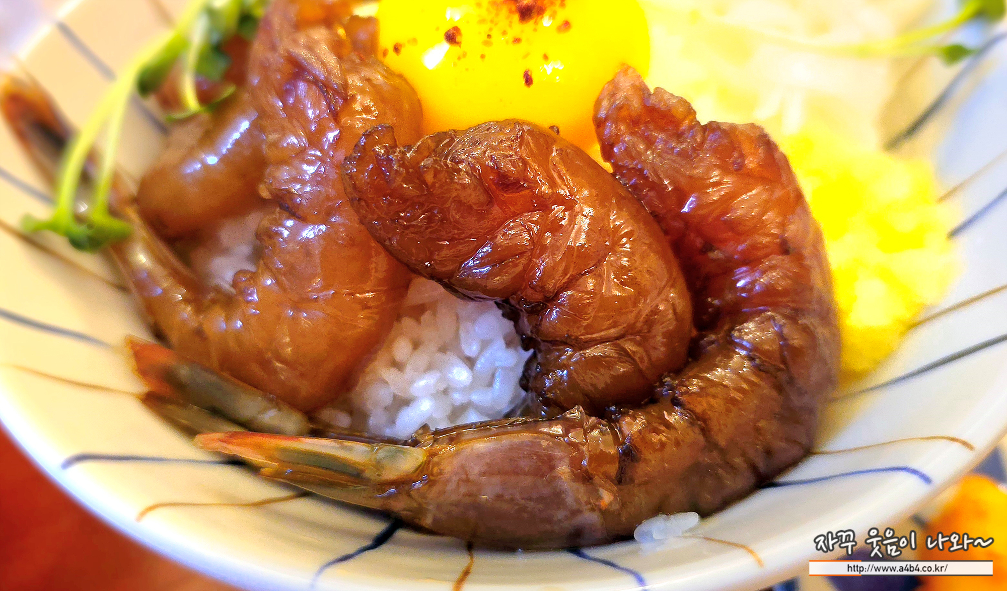 통통하면사 짭짤한 맛을 보여주는 간장새우 다섯 마리와 계란 노른자, 토핑들이 올려 있습니다.