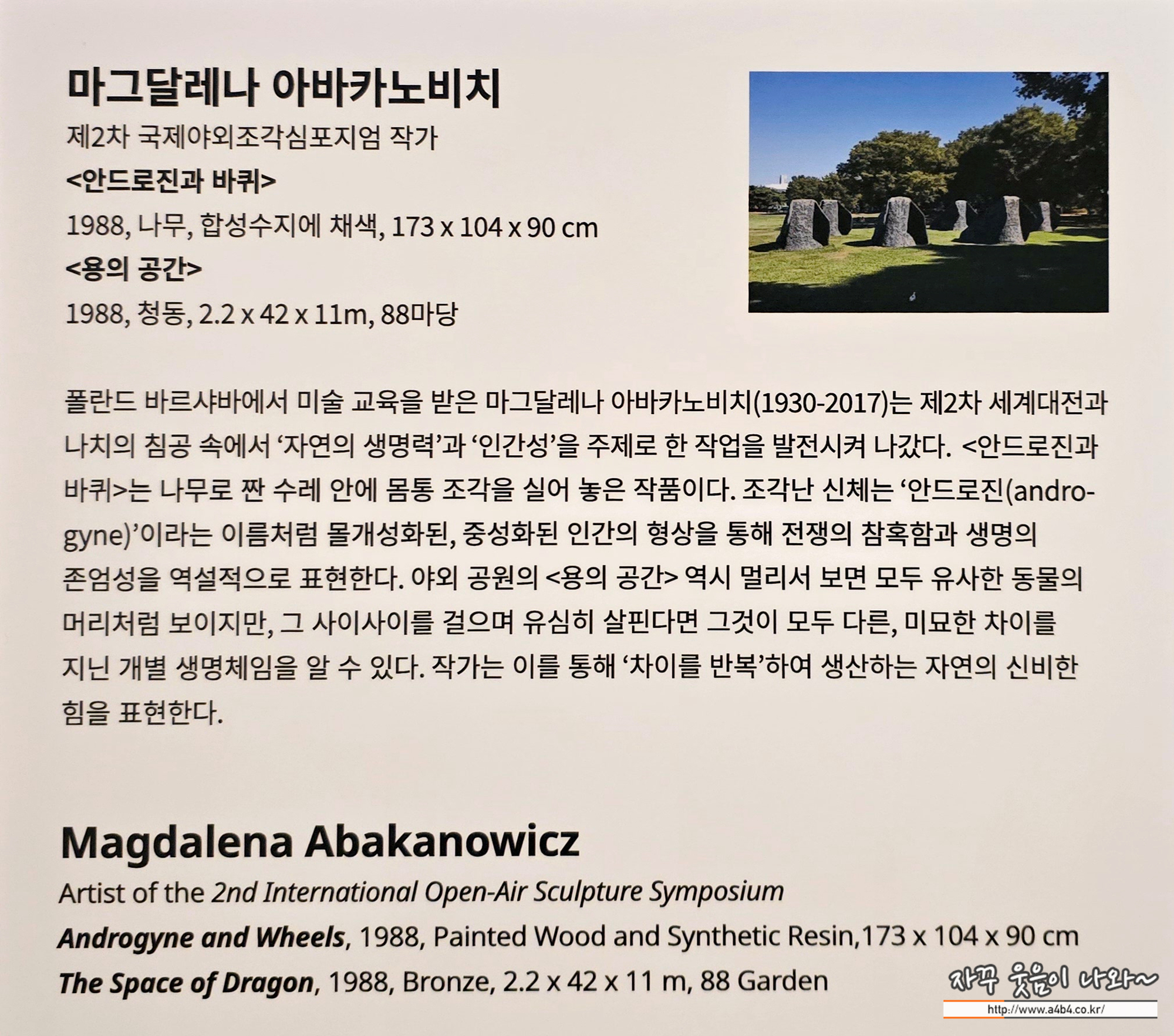 폴란드 바르샤바에서 미술 교육을 받은 마그달레나 아바카노비치(1930-2017)는 제2차 세계대전과 나치의 침공 속에서 자연의 생명력'과 '인간성'을 주제로 한 작업을 발전시켜 나갔다. <안드로진과 바퀴>는 나무로 짠 수레 안에 몸통 조각을 실어 놓은 작품이다. 조각난 신체는 '안드로진(andro-gyne)'이라는 이름처럼 몰개성화된, 중성화된 인간의 형상을 통해 전쟁의 참혹함과 생명의 존엄성을 역설적으로 표현한다. 야외 공원의 <용의 공간> 역시 멀리서 보면 모두 유사한 동물의 머리처럼 보이지만, 그 사이사이를 걸으며 유심히 살핀다면 그것이 모두 다른, 미묘한 차이를 지닌 개별 생명체임을 알 수 있다. 작가는 이를 통해 '차이를 반복'하여 생산하는 자연의 신비한 힘을 표현한다.