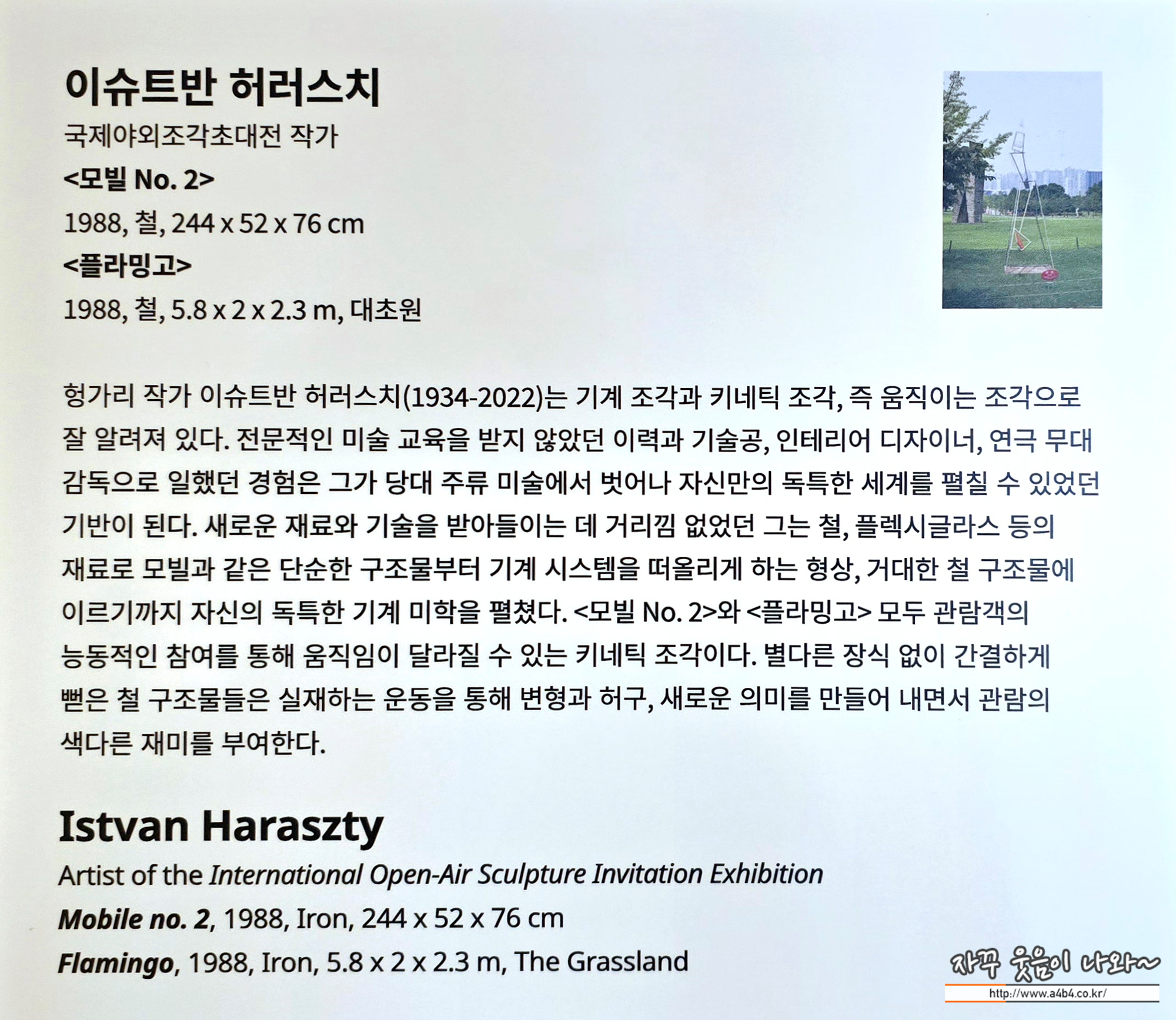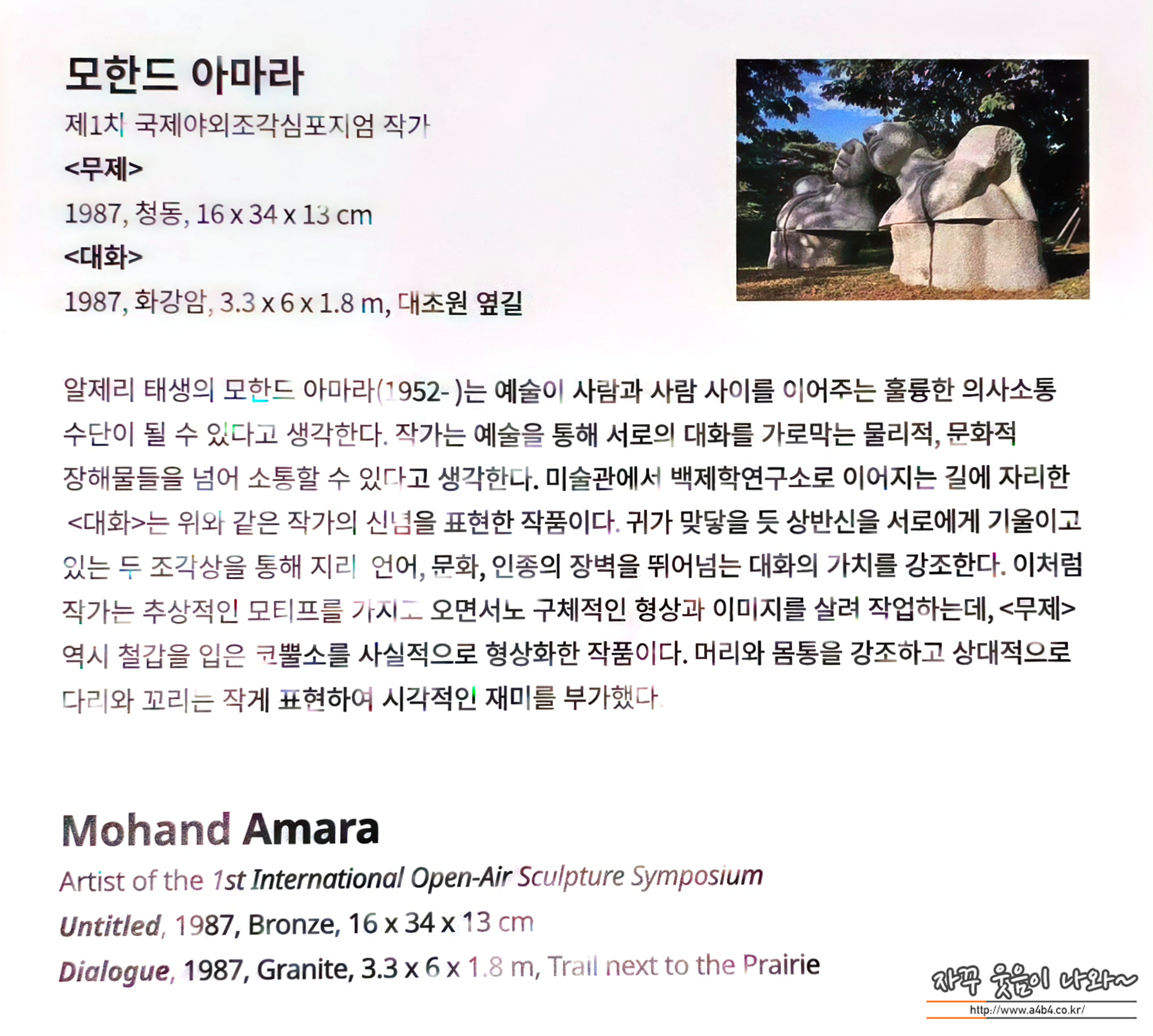 모한드 아마라의 대화 작품 또한 올림픽공원에 전시된 수 많은 작품중에 대표적인 작품 중 하나입니다. 당시에는 상당히 독특한 작품으로 신문 지면을 장식하기도 했는데요. 아쉽게도 이 작품앞을 그렇게 많이 다니면서도 찍어놓은 사진 한 장 없네요. 다음에는 꼭 작품을 다시 한 번 자세하게 감상해야 겠네요.