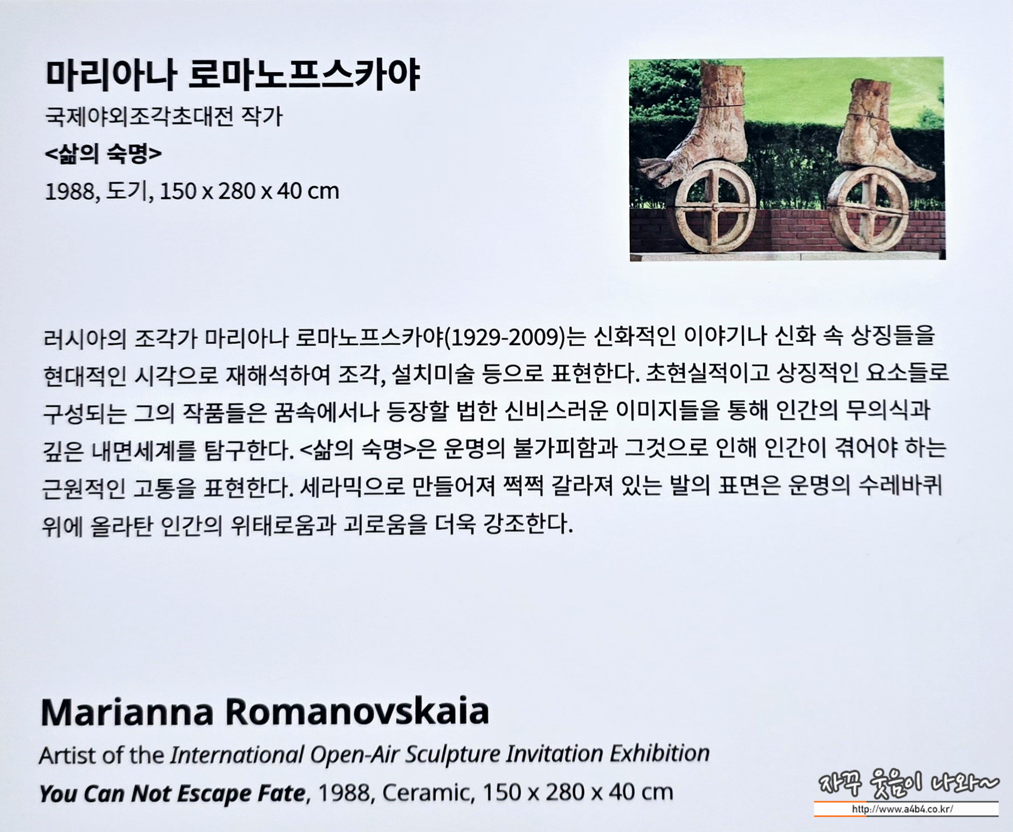 러시아의 조각가 마리아나 로마노프스카야(1929-2009)는 신화적인 이야기나 신화 속 상징들을 현대적인 시각으로 재해석하여 조각, 설치미술 등으로 표현한다. 초현실적이고 상징적인 요소들로 구성되는 그의 작품들은 꿈속에서나 등장할 법한 신비스러운 이미지들을 통해 인간의 무의식과 깊은 내면세계를 탐구한다. <삶의 숙명>은 운명의 불가피함과 그것으로 인해 인간이 겪어야 하는 근원적인 고통을 표현한다. 세라믹으로 만들어져 쩍쩍 갈라져 있는 발의 표면은 운명의 수레바퀴 위에 올라탄 인간의 위태로움과 괴로움을 더욱 강조한다.