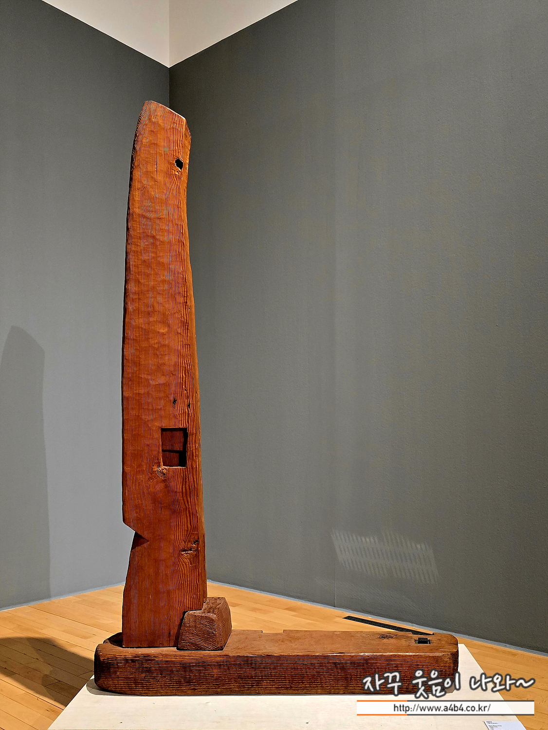 여러 개의 나무 블록을 수직으로 높게 올려 내면서 작품을 만들어 내는 작가는 <함정이 있는 통행로와 건널목> 역시도 그런 방식으로 제작했다. 1관 2전시실 중앙을 가로지르고 있는 이 작품은 9개의 나무 블록이 연결되어 하나의 긴 통행로 내지 건널목을 이룬다. 사람과 사람, 문명과 문명 사이의 교차를 상징하는 건널목은 좌우에 세자르 발디치니의 <압축>과 심문섭의 <목신>을 세워둔 채 동서양의 만남을 기념하는 독특한 기념비가 된다