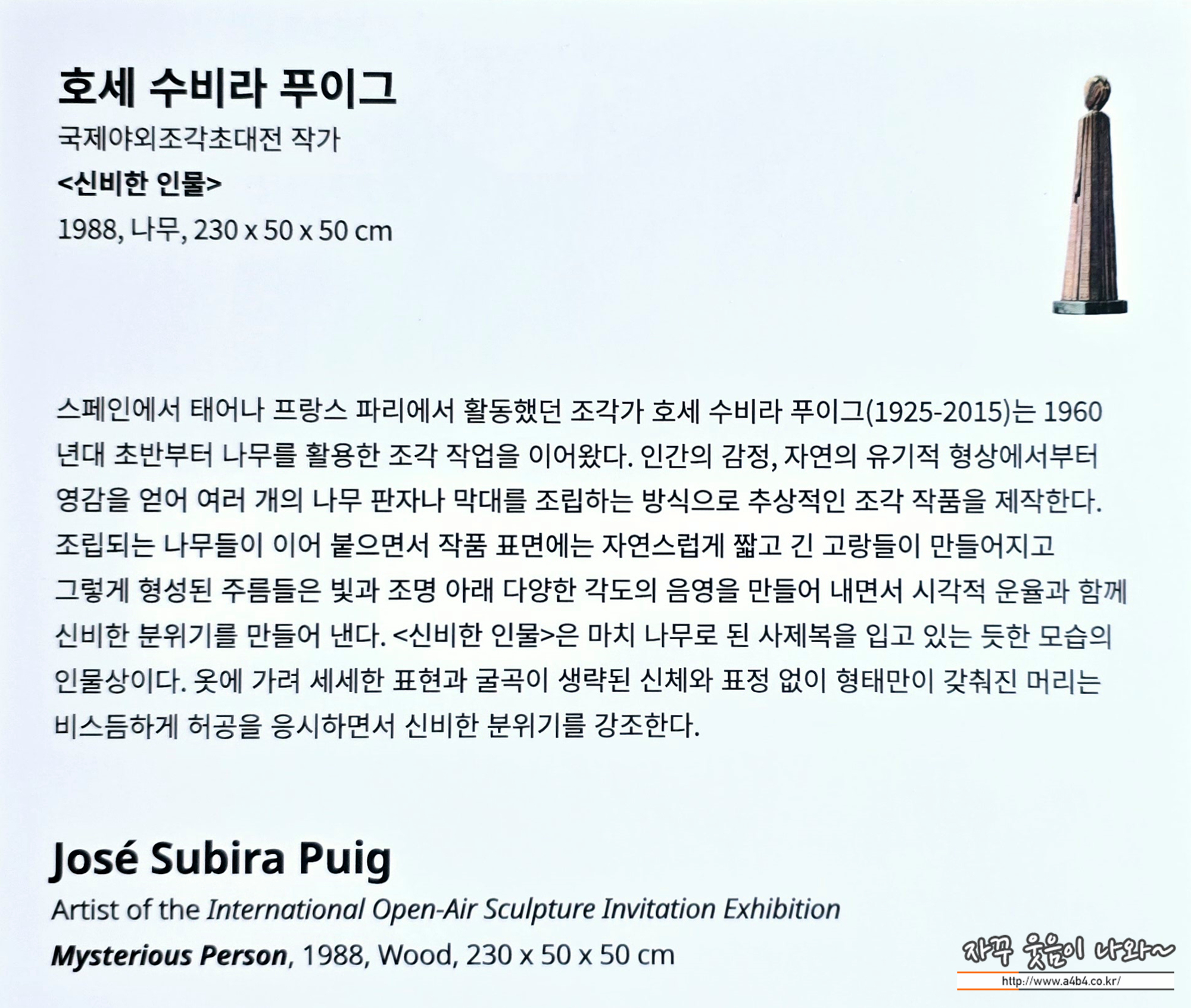 스페인에서 태어나 프랑스 파리에서 활동했던 조각가 호세 수비라 푸이그(1925-2015)는 1960 년대 초반부터 나무를 활용한 조각 작업을 이어왔다. 인간의 감정, 자연의 유기적 형상에서부터 영감을 얻어 여러 개의 나무 판자나 막대를 조립하는 방식으로 추상적인 조각 작품을 제작한다.