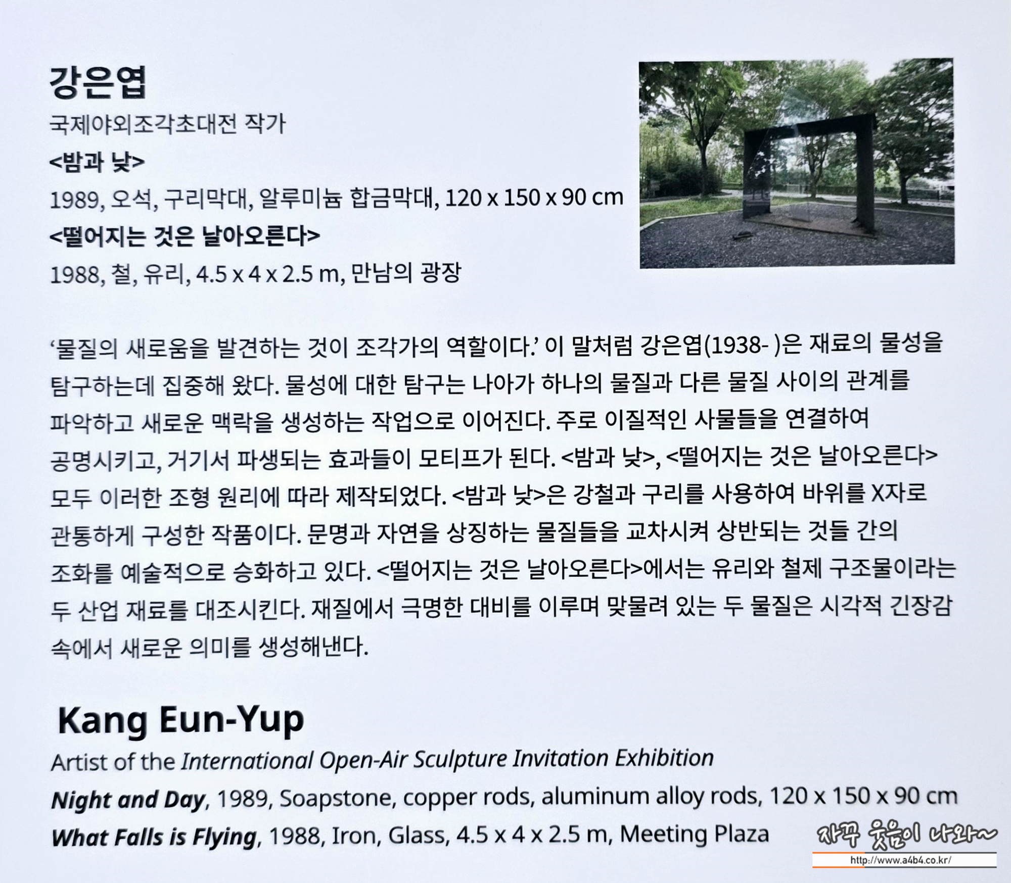 물질의 새로움을 발견하는 것이 조각가의 역할이다.' 이 말처럼 강은엽(1938- )은 재료의 물성을 탐구하는데 집중해 왔다.물성에 대한 탐구는 나아가 하나의 물질과 다른 물질 사이의 관계를 파악하고 새로운 맥락을 생성하는 작업으로 이어진다. 주로 이질적인 사물들을 연결하여 공명시키고, 거기서 파생되는 효과들이 모티프가 된다. <밤과 낮>, <떨어지는 것은 날아오른다> 모두 이러한 조형 원리에 따라 제작되었다. <밤과 낮>은 강철과 구리를 사용하여 바위를 X자로 관통하게 구성한 작품이다. 문명과 자연을 상징하는 물질들을 교차시켜 상반되는 것들 간의 조화를 예술적으로 승화하고 있다. <떨어지는 것은 날아오른다>에서는 유리와 철제 구조물이라는 두 산업 재료를 대조시킨다. 재질에서 극명한 대비를 이루며 맞물려 있는 두 물질은 시각적 긴장감 속에서 새로운 의미를 생성해낸다.