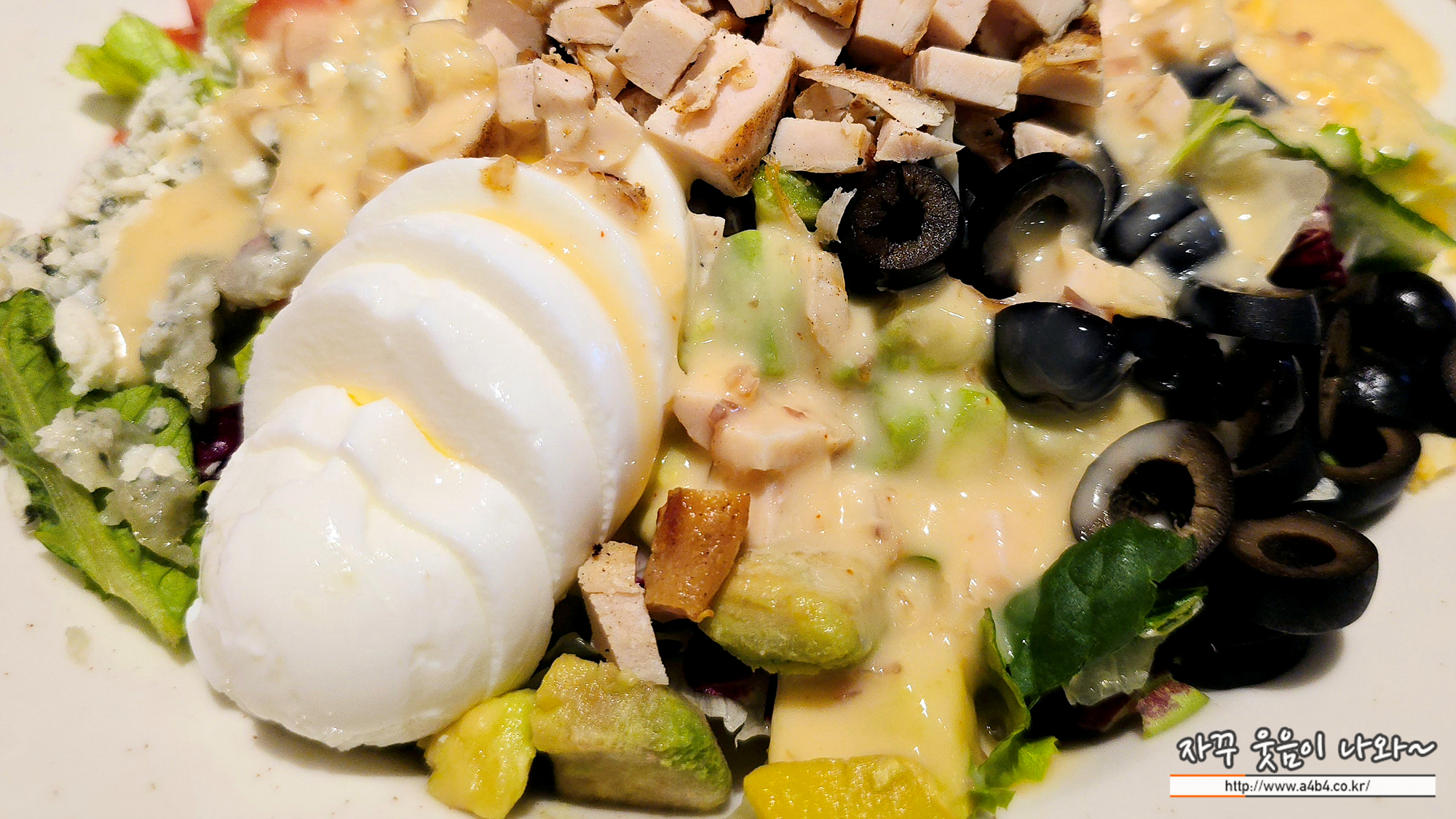 콥 샐러드는 다양한 재료가 조화롭게 어우러진 미국 스타일의 샐러드로 1937년 미국 LA 헐리우드의 한 레스토랑에서 늦은 밤 남은 재료들을 활용하여 만들어진 것이 시작이라고 하는데요. 소스와 함께 다양한 식감을 맛볼 수 있어 제가 좋하는 메뉴 중 하니입니다.