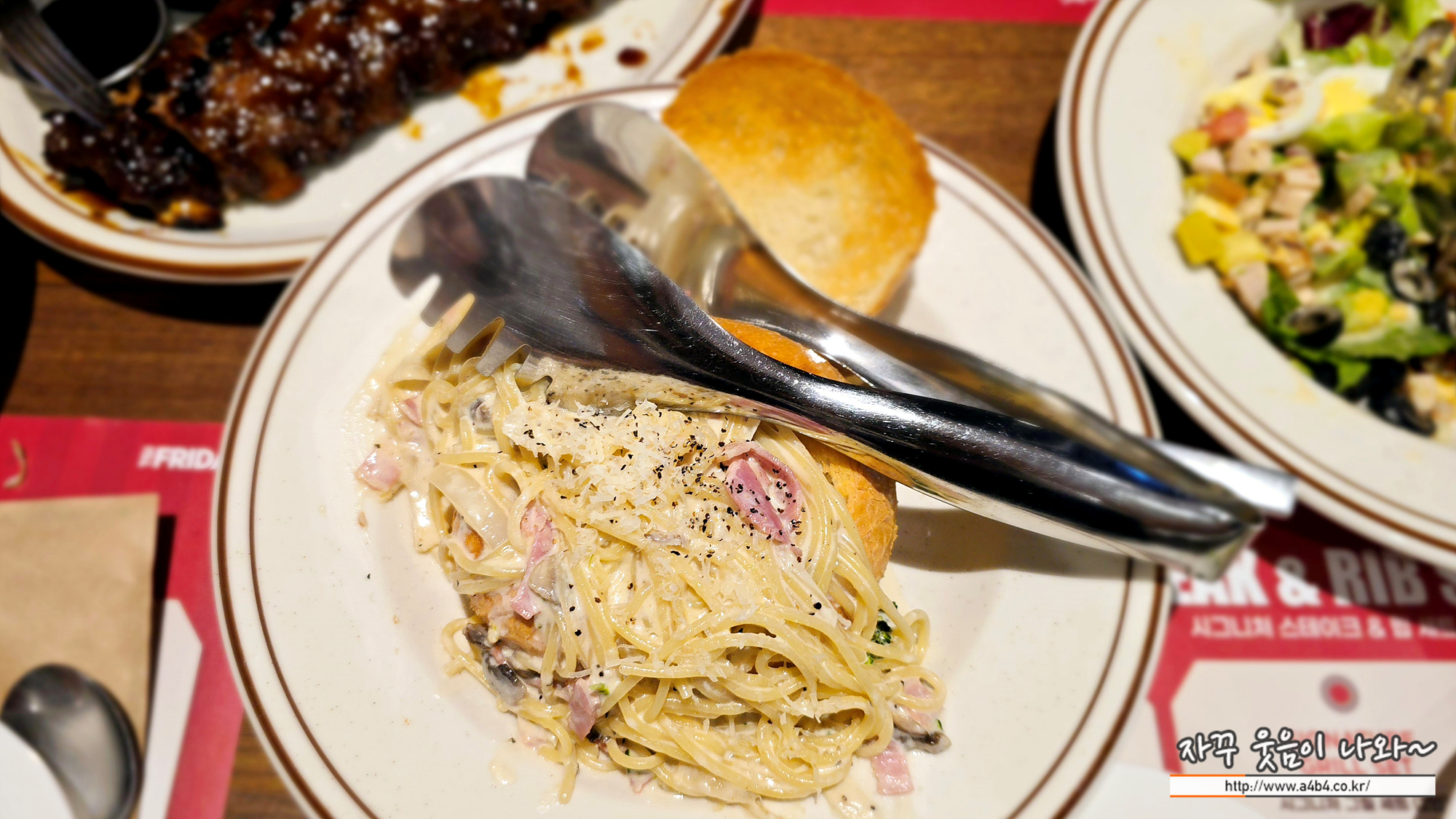 TGIF 3인세트메뉴에는 파스타 또는 라이스 중 하나 선택이 가능합니다. 저희는 빠네크림 파스타 주문했습니다. 고소한 크림소스와 파마산 치즈가 얹어진 빠네크림 파스타.