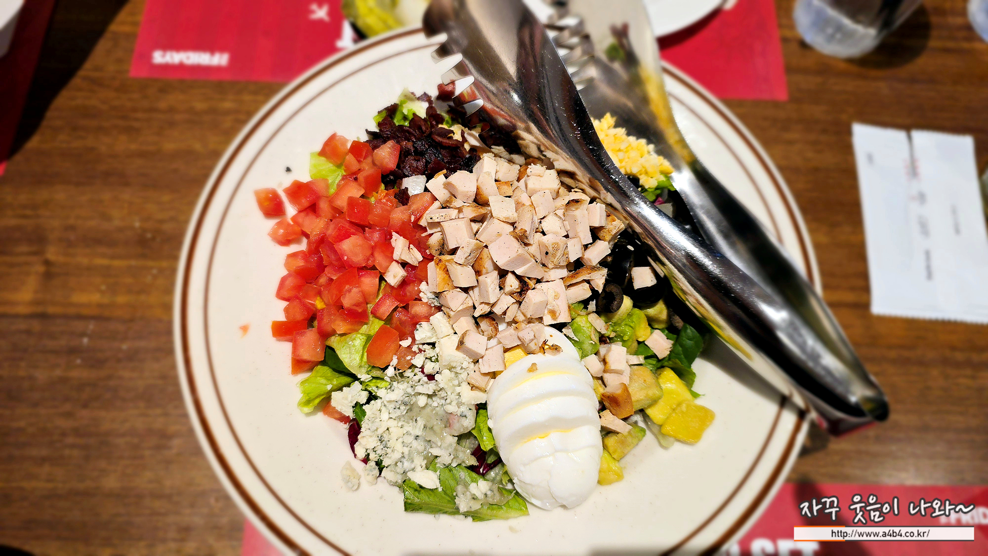 콥 샐러드는 다양한 재료가 조화롭게 어우러진 미국 스타일의 샐러드로 1937년 미국 LA 헐리우드의 한 레스토랑에서 늦은 밤 남은 재료들을 활용하여 만들어진 것이 시작이라고 하는데요. 소스와 함께 다양한 식감을 맛볼 수 있어 제가 좋하는 메뉴 중 하니입니다.