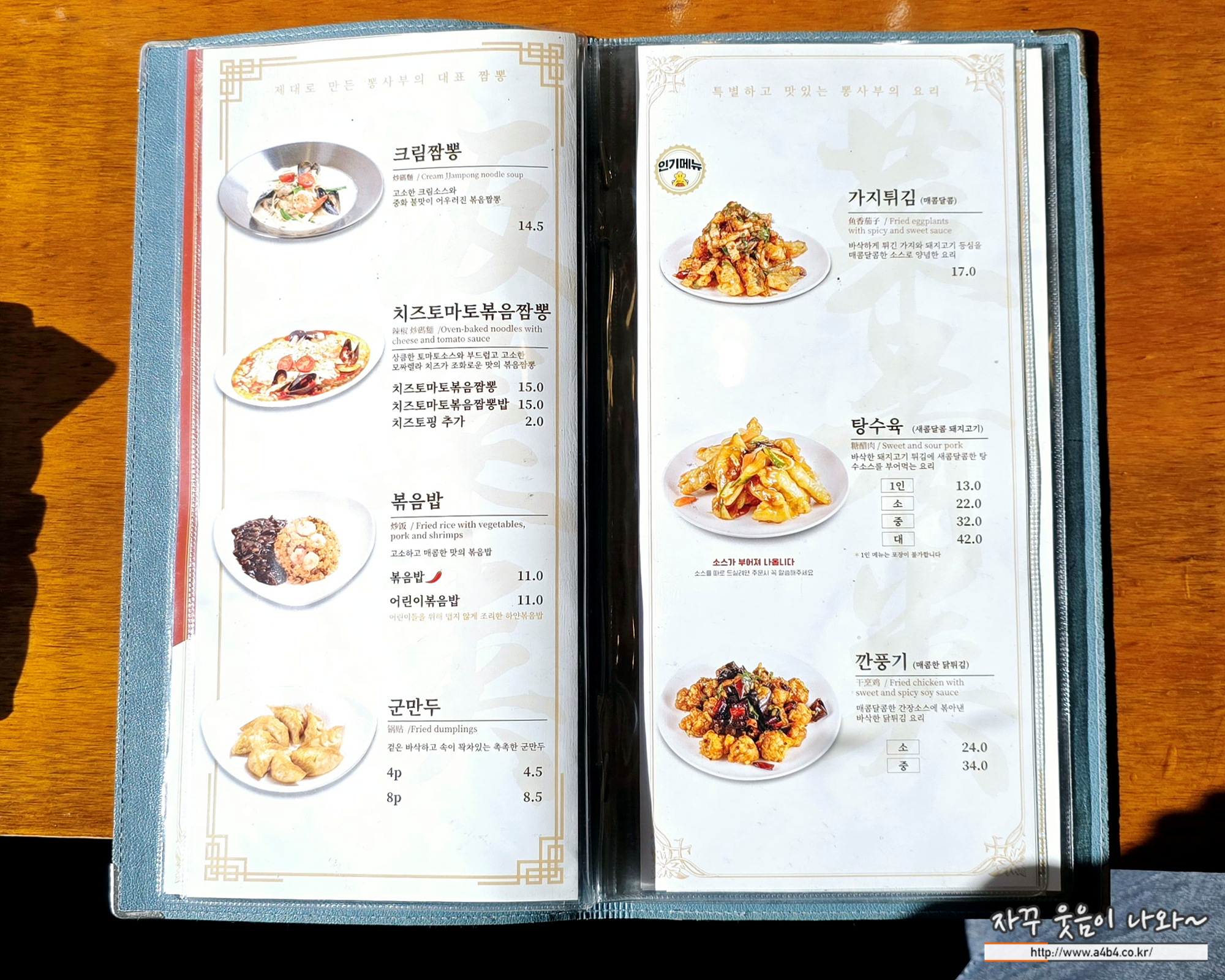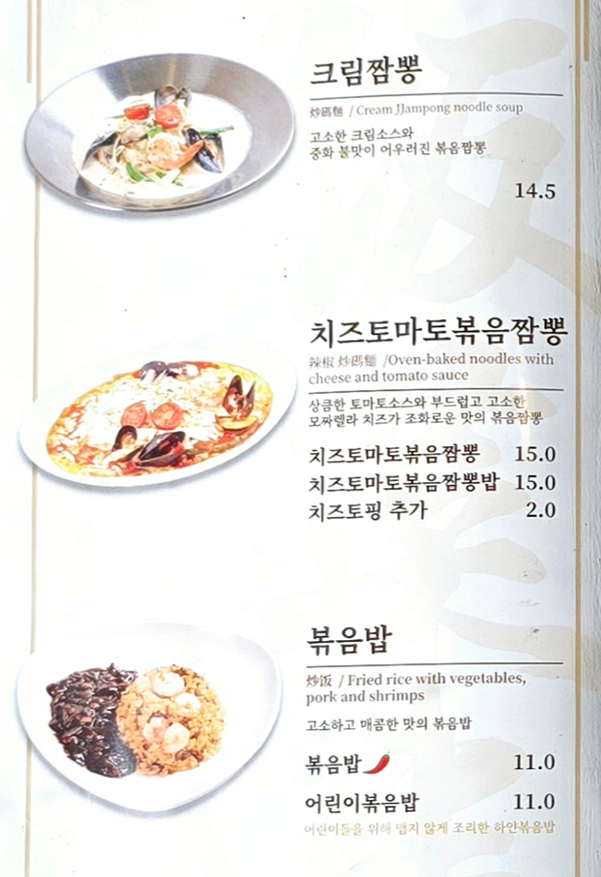 이름과 같이 짬뽕은 다양한 메뉴를 준비하고 있습니다. 한우뼈 육수로 만든 뽕사부 짬뽕, 매운짬뽕, 순한백짬뽕과 아이들이 좋아할 것같은 크림짬뽕과 치즈토마토볶음짬뽕도 만나볼 수 있습니다.