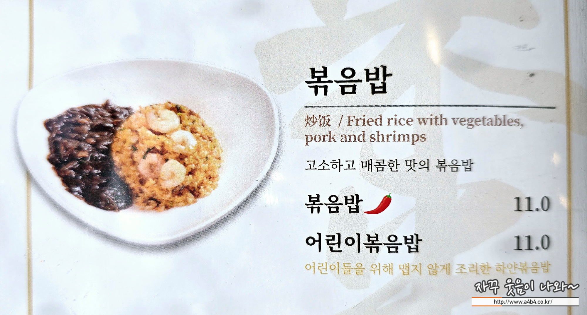 짜장면과 마찬가지로 뽕사부 볶음밥도 단 한 종류만 있습니다. 어린이를 위해 맵지 않게 조리한 어린이 볶음밥도 있다고 하는데요. 아마도 그냥 계란밥에 짜장이 올라가 있을 것 같네요.