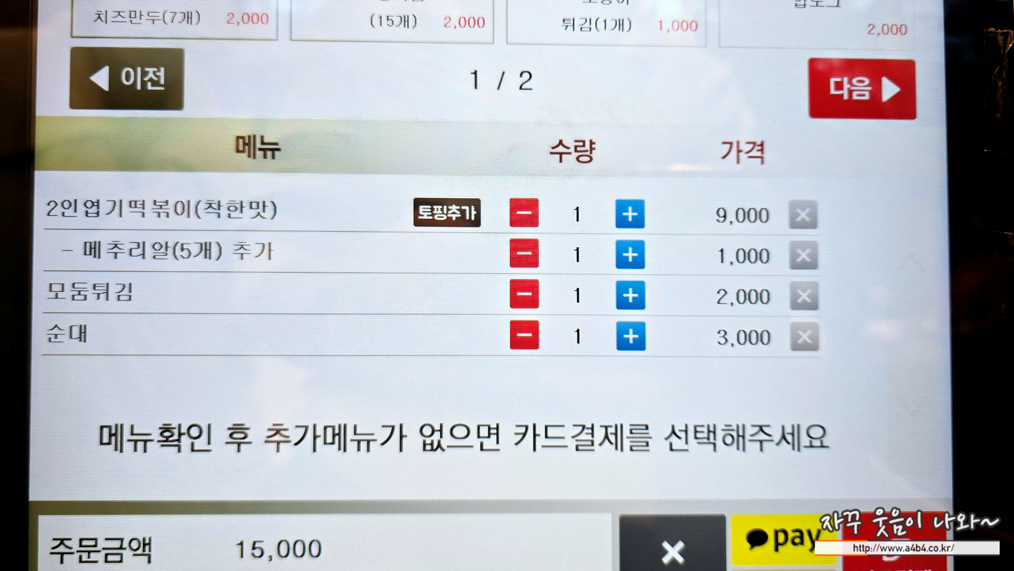 2인 엽기떡볶이, 메추리알, 모둠튀김, 순대 총 15,000원 입니다. 배달보다 훨씬 저렴한 가격인데요.