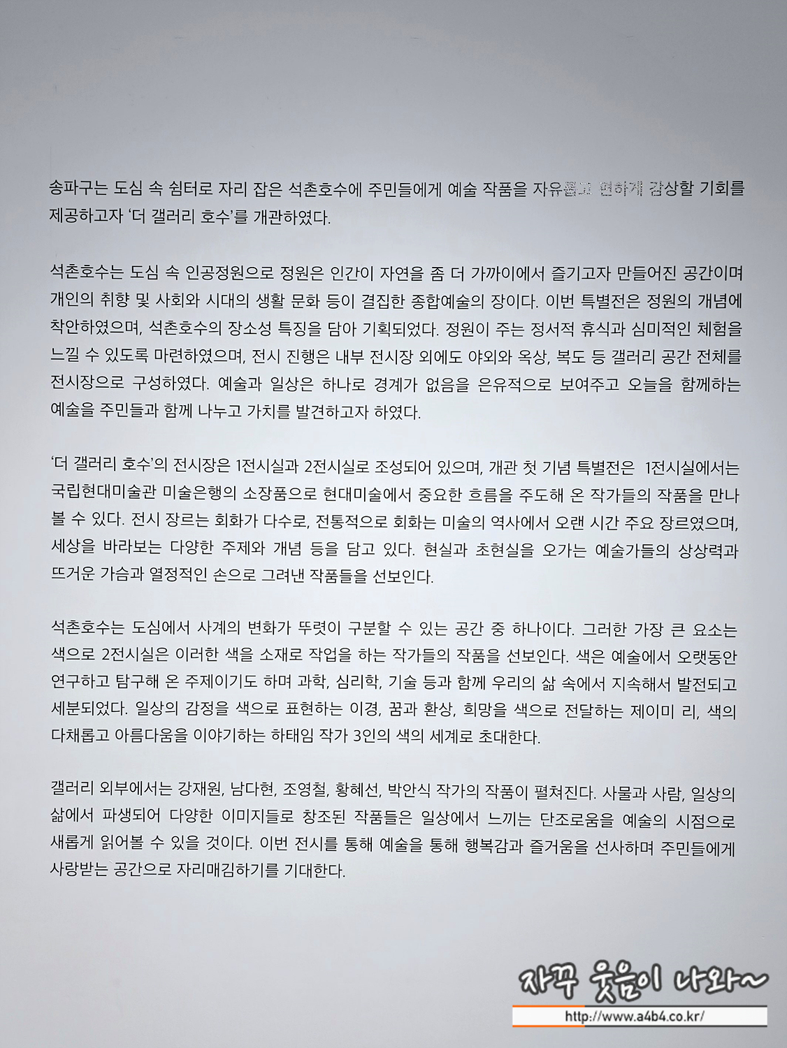 오늘은 수년간의 공사끝에 오픈한 잠실 석촌호수 동호에 위치한 잠실 더 갤러리 호수 개관전 관람후기 였습니다.