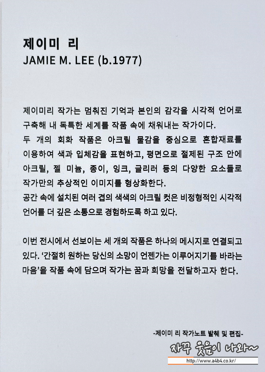 제이미리 작가는 한국가 미국을 오가면서 활동하며, 평면 작품을 넘어 다양한 입체 작품으로 작업영역을 넓혀가고 있는 멈춰진 기억과 본인의 감각을 시각적 언어로 구축해 내 독특한 세계를 작품 속에 채워내는 작가이다.