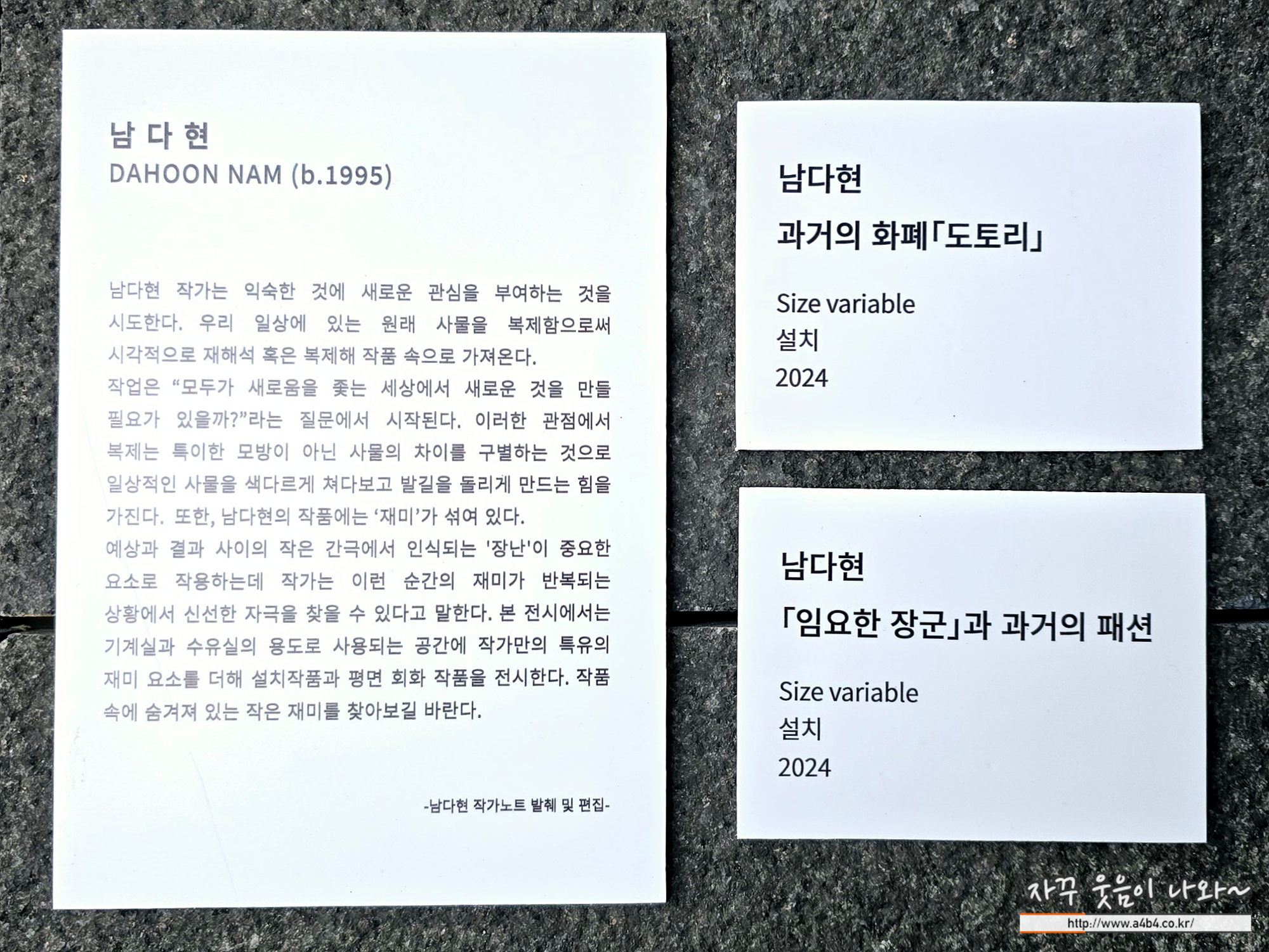 재미 요소를 더해 설치작품과 평면 회화 작품을 전시한다. 작품속에 숨겨져 있는 작은 재미를 찾아보길 바란다.