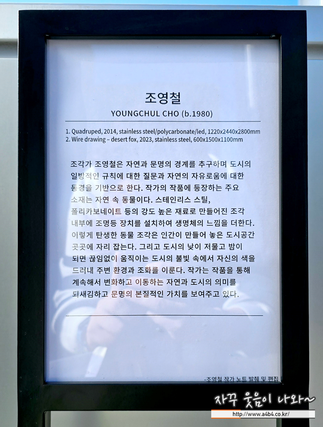 조영철 작가는 자연, 인간, 그리고 현대 사회의 관계를 탐구하는 조각 및 설치미술 작업을 한다. 여우는 전통적으로 지혜와 신비, 그리고 교활함을 상징하는 동물로, 작가는 이를 현대적이고 추상적인 방식으로 재해석하여 다양한 감정을 담은 상징적 존재로 표현하고자 한다. 조각은 스테인리스 스틸 선을 사용해 제작되었다. 금속의 반짝이는 표면과 구슬을 사용해 빛나는 눈은 여우의 신비로운 이미지를 극대화하며, 자연의 곡선과 인간적 감각이 조화된 독특한 형태로 구현된다