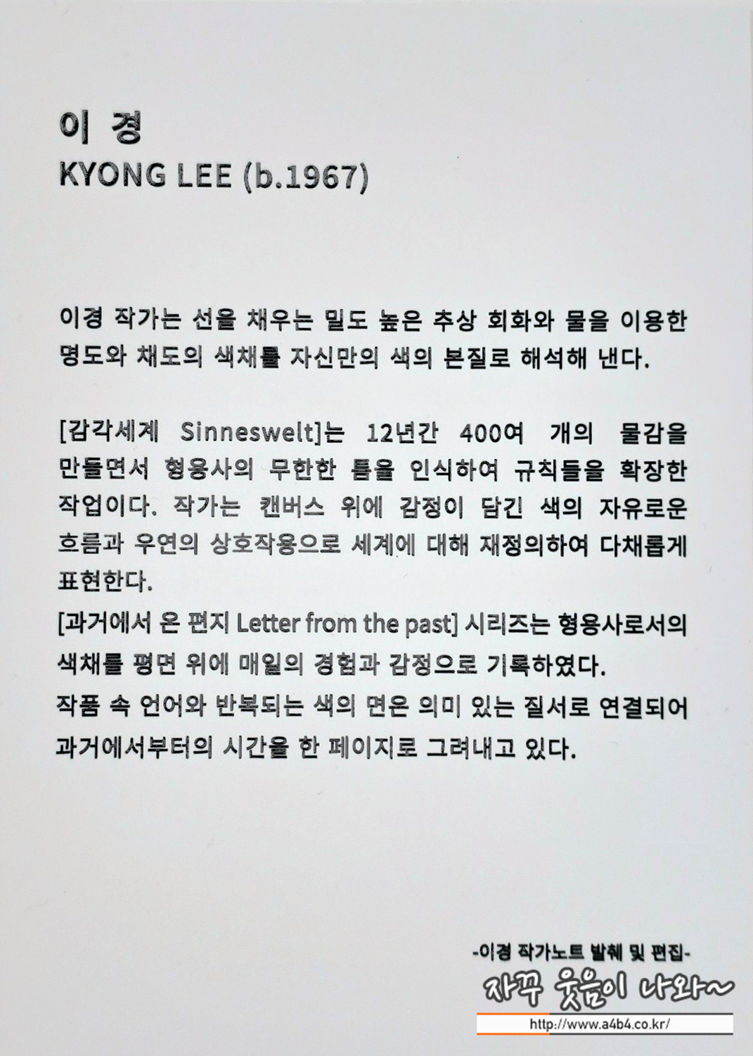이경 작가는 선을 채우는 밀도 높은 추상 회화와 물을 이용한 명도와 채도의 색채를 자신만의 색의 본질로 해석해 낸다.