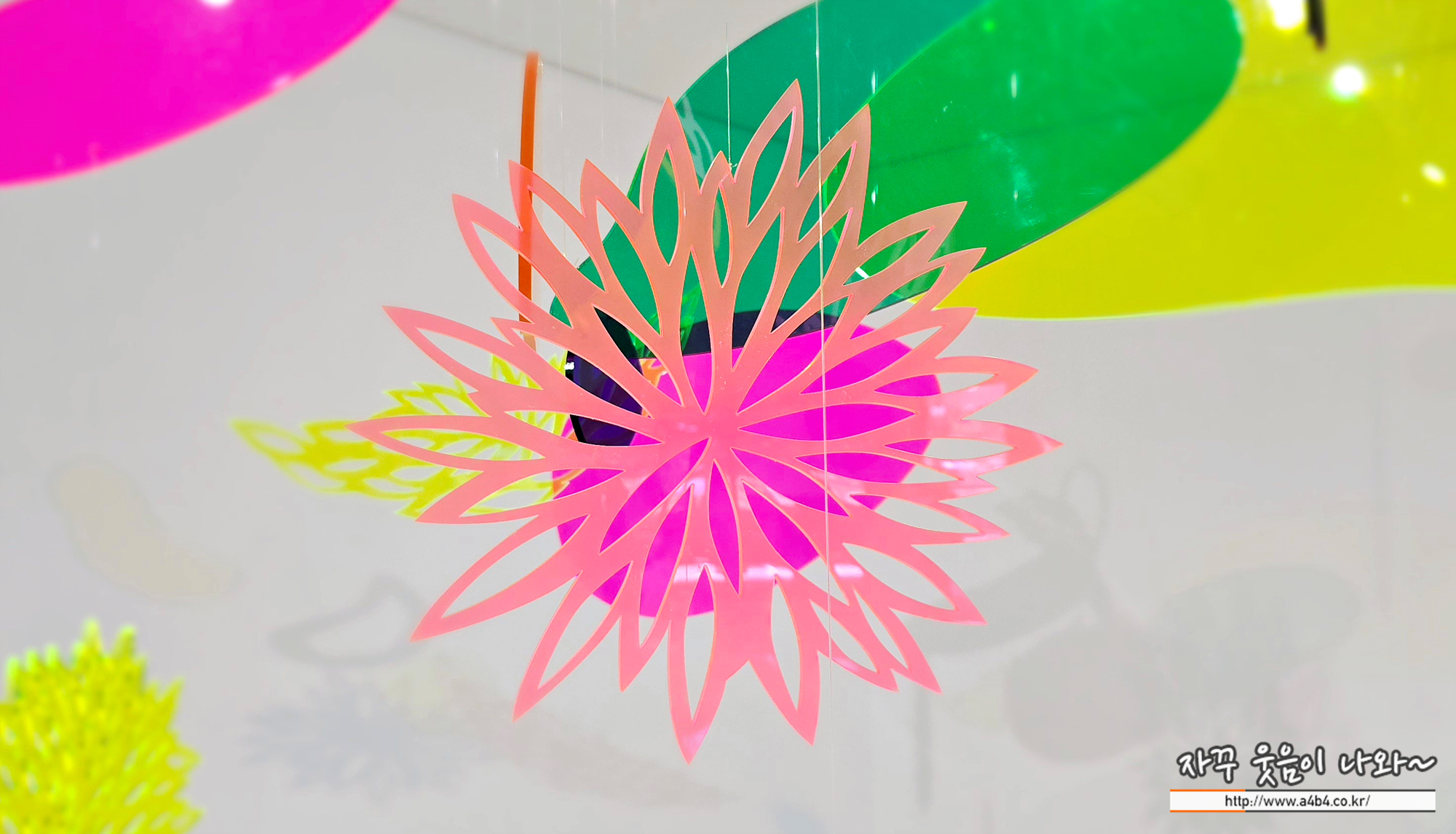 공간 속에 설치된 여러 겹의 색색의 아크릴 컷은 비정형적인 시각적 언어를 더 깊은 소통으로 경험하도록 하고 있다.