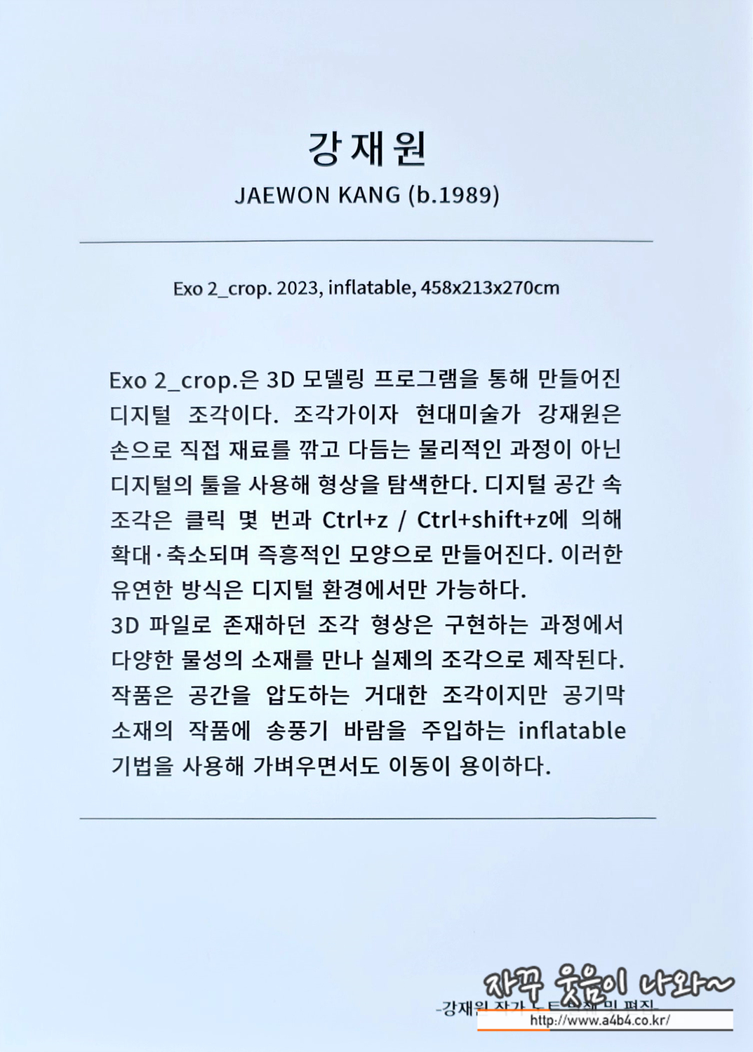 Exo 2_crop.은 3D 모델링 프로그램을 통해 만들어진 디지털 조각이다. 조각가이자 현대미술가 강재원은 손으로 직접 재료를 깎고 다듬는 물리적인 과정이 아닌 디지털의 툴을 사용해 형상을 탐색한다. 디지털 공간속 조각은 클릭 몇 번과 Ctrl+z / Ctrl+shift+z에 의해 확대.축소되며 즉흥적인 모양으로 만들어진다. 이러한 유연한 방식은 디지털 환경에서만 가능하다.