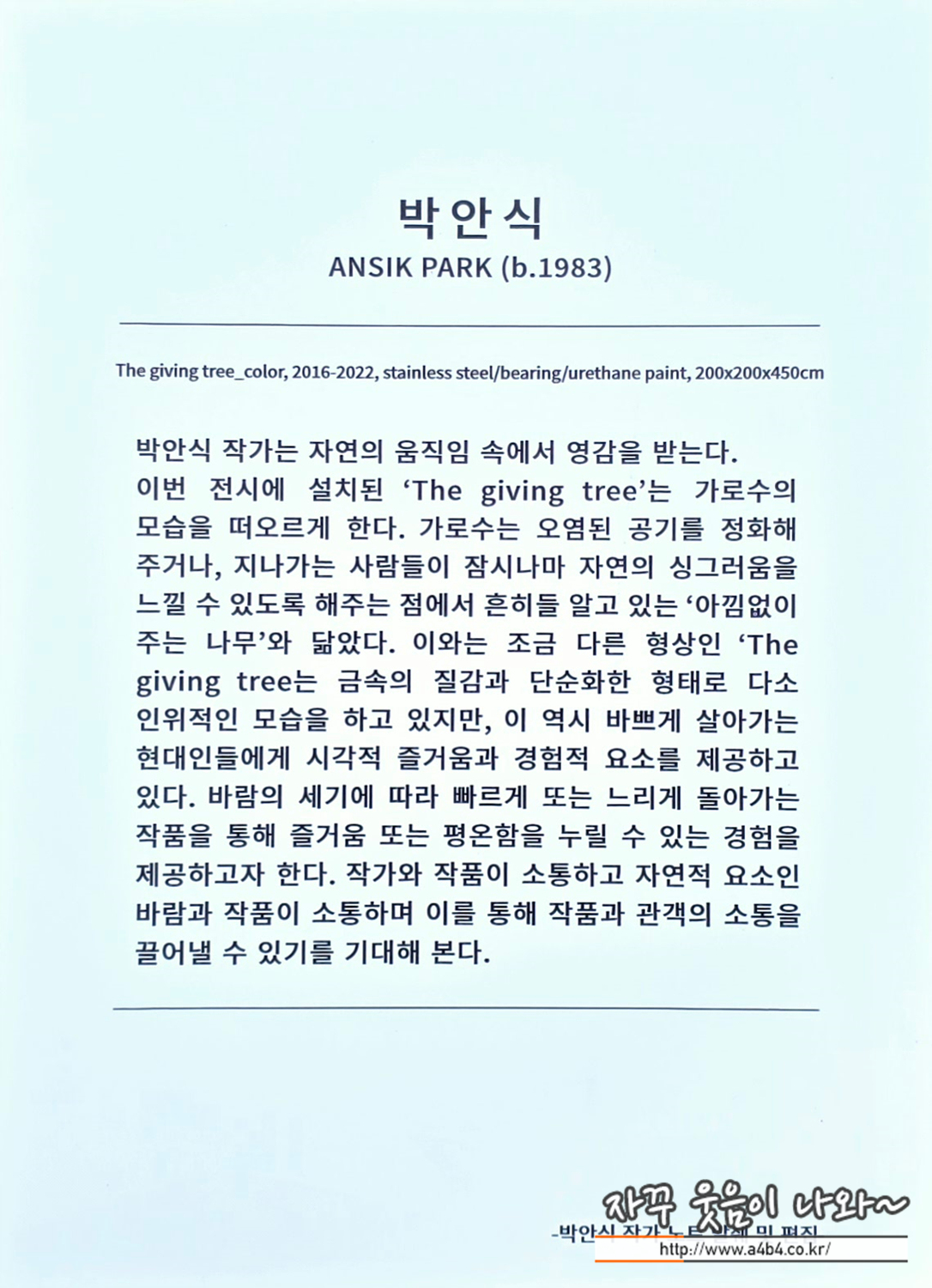 이번 전시에 설치된 The givingé tree'는 가로수의 모습을 떠오르게 한다. 가로수는 오염된 공기를 정화해 주거나, 지나가는 사람들이 잠시나마 자연의 싱그러움을 느낄 수 있도록 해주는 점에서 흔히들 알고 있는 '아낌없이 주는 나무'와 닮았다. 이와는 조금 다른 형상인 The giving tree는 금속의 질감과 단순화한 형태로 다소 인위적인 모습을 하고 있지만, 이 역시 바쁘게 살아가는 현대인들에게 시각적 즐거움과 경험적 요소를 제공하고 있다.