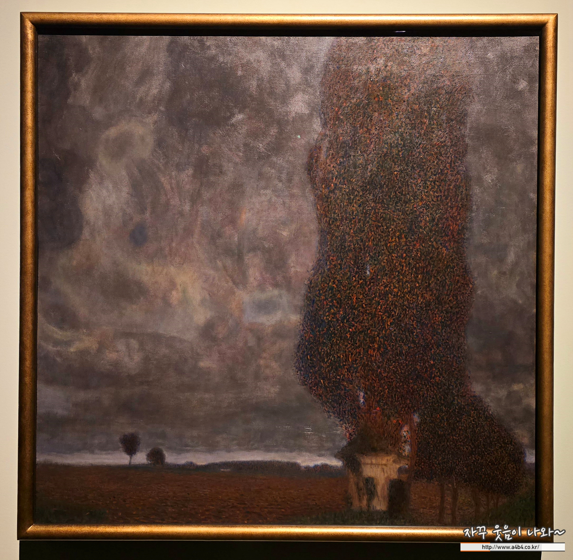 클림트의 풍경화에서 거대한 포플러나무는 작품의 오른편을 가득 채우고 있죠. 나무를 잘 보시면 여러 가지 색 물감을 찍어서 반짝이는 효과를 냈습니다.어떤 평론가는 이것을 '마치 송어의 비늘 같다'고 말했어요. 멀리 펼쳐진 들판 너머로 하늘이 크게 그려져 있는데, 바람이 소용돌이치듯이 불고 먹구름이 져 금방이라도 폭풍우가 쏟아질 것 같네요. 하늘을 극적이고 생생하게 그렸던 화가가 한 명 떠오르지 않나요? 바로 빈센트 반 고흐의 영향을 받은 것입니다. 클림트도 유럽에서 유행했던 인상주의의 영향을 받았다는 것을 알 수 있어요. 당시에는 일반적이지 않은 정사각형 화폭을 선택한 것도 참 클림트답다는 생각이 듭니다
