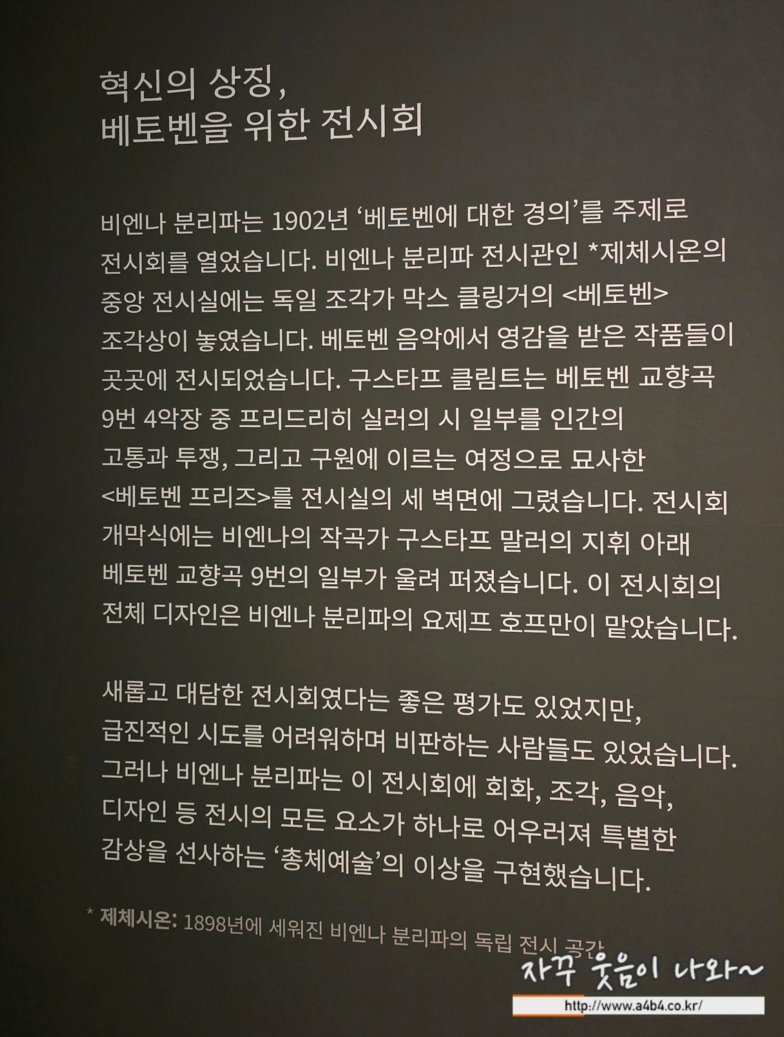 비엔나 분리파는 1902년 ‘베토벤에 대한 경의’를 주제로 전시회를 열었습니다. 비엔나 분리파 전시관인 *제체시온의 중앙 전시실에는 독일 조각가 막스 클링거의 <베토벤> 조각상이 놓였습니다. 베토벤 음악에서 영감을 받은 작품들이 곳곳에 전시되었습니다. 구스타프 클림트는 베토벤 교향곡 9번 4악장 중 프리드리히 실러의 시 일부를 인간의 고통과 투쟁, 그리고 구원에 이르는 여정으로 묘사한 <베토벤 프리즈>를 전시실의 세 벽면에 그렸습니다.