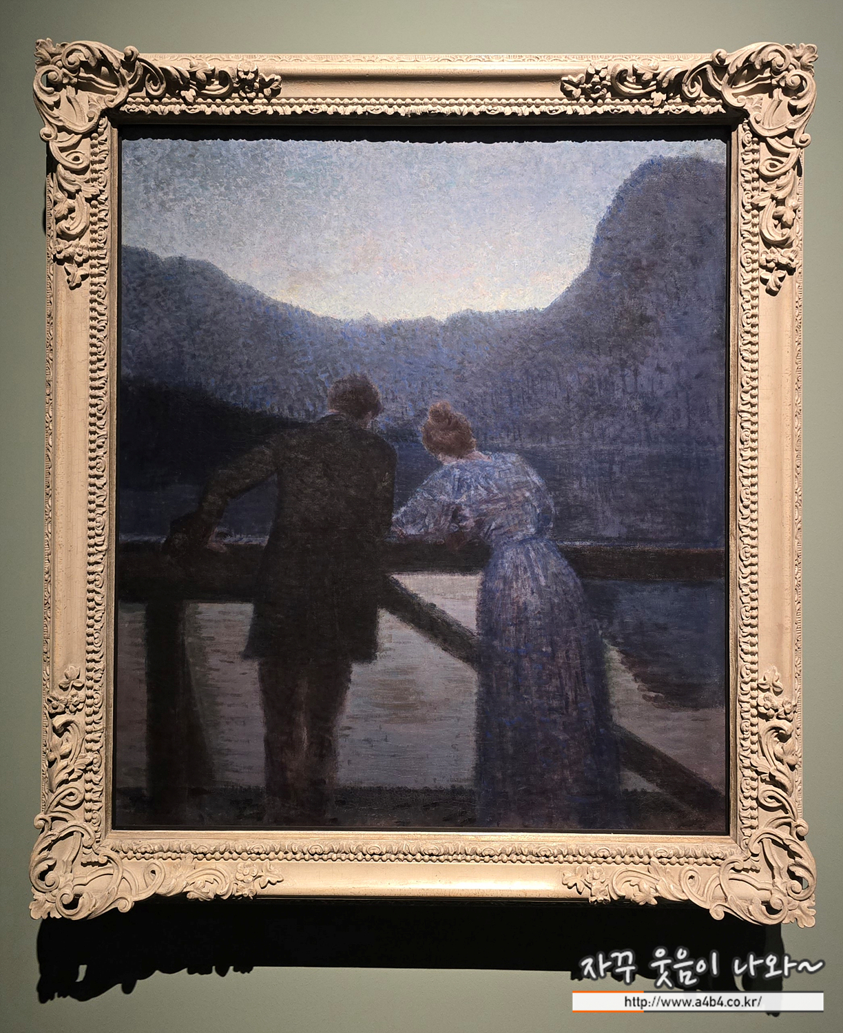 그림 속 남녀는 호숫가 난간에 기댄 채 서로의 시선을 피해 먼 곳을 바라 보고 있다. 비엔나 분리파의 창립 회원인 에른스트 슈퇴어는 이 작품에서 여러 빛깔의 색들을 섞지 않고 점을 찍어서 표현하는 기법을 사용했다. 화면을 가득 채운 파란색과 연보라색 점들이 왠지 우울하고 쓸쓸한 감정을 자아낸다. 슈퇴어는 주로 희미한 저녁 빛을 표현해 서정적인 장면을 연출했고, 삶의 의미에 대한 철학적인 생각을 담아내고자 했다.
