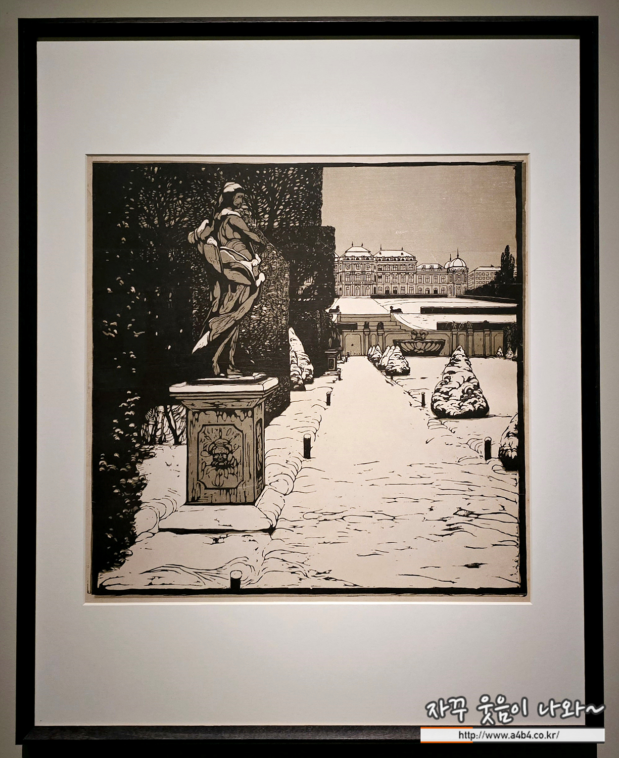 19세기 후반 비엔나에서는 목판화 제작이 활발하게 이루어졌다. 비엔나 분리파의 창립 회원이었던 카를 몰 역시 비엔나 풍경을 담은 판화를 많이 만들었다. 이 판화는 벨베데레 궁전 정원의 겨울 풍경을 담고 있다. 왼쪽에 보이는 조각상에서 쭉 뻗은 정원 길을 따라 벨베데레 궁전으로 시선이 자연스럽게 이어진다. 몰은 빛의 반사와 섬세한 색감을 세련되게 활용하여 겨울 분위기를 표현했다.