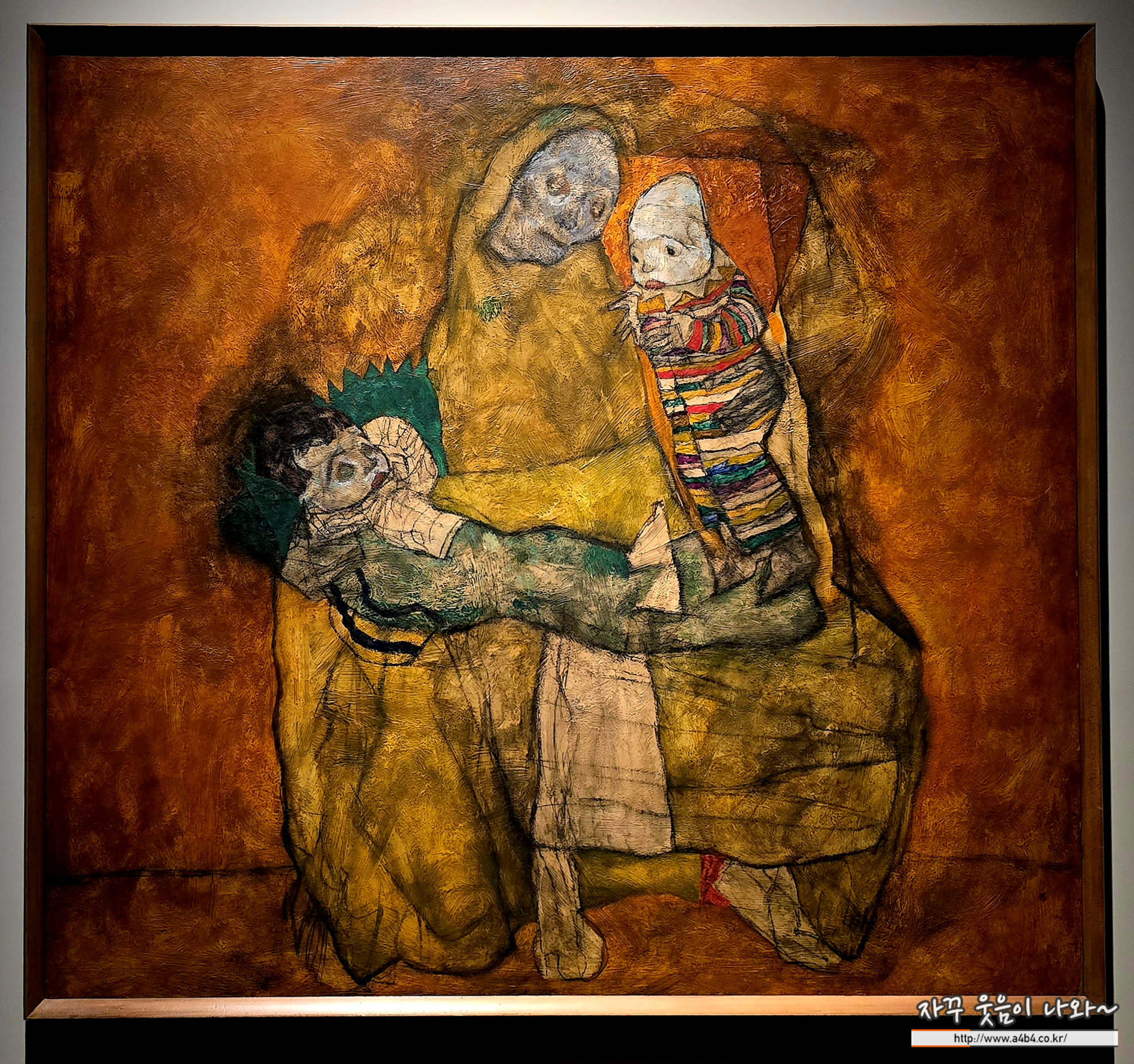 예수 그리스도의 시신을 품에 안은 성모 마리아의 모습을 피에타'라고 합니다. 이 작품은 온몸을 녹색 천으로 감싼 어머니가 두 아이를 안고 있어, 에곤 실레가 '피에타'의 구도를 사용하고 있음을 알 수 있습니다. 그러나 어머니외 아들의 얼굴은 죽은 듯 해골처럼 창백하게 그려졌고, 원작의 피에타'의 구도에 존재하지 않는 어린 아이가 공중에 떠 있습니다.이 어린 아이는 색색의 줄무늬 옷을 입고 죽은 듯한 어머니와 다른 아이를 절망하는 표정으로 바라보고 있습니다. 어머니와 잘 지내고 싶었던 에곤 실레의 복잡한 감정들이 작품 곳곳에 표현돼 있는 것 같습니다.