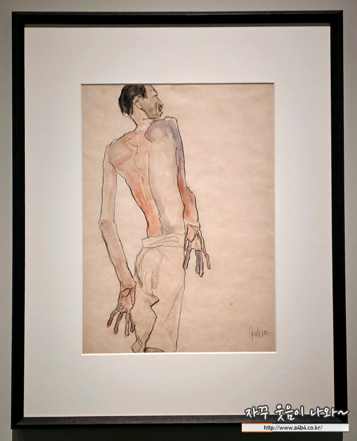 1910년 무렵 에곤 실레는 누드와 자화상을 중심으로 작업했고 훨씬 성숙한 표현주의 화법을 선보였다. 실레는 자화상을 그릴 때 거울에 자신의 몸을 비춰 가며 자세를 연구했다. 이 반신 누드의 남성 역시 거울에 비친 자신의 모습을 연구하는 과정에서 그려진 것으로 보인다. 빠르고 강한 선으로 그린 남성의 깡마른 몸은 과장된 비례와 비틀린 자세로 실레 특유의 인체 표현을 보여 준다. 빨간색, 파란색, 보라색으로 옅게 칠해진 몸과 굽은 손의 색감은 과장된 표현을 강조한다.