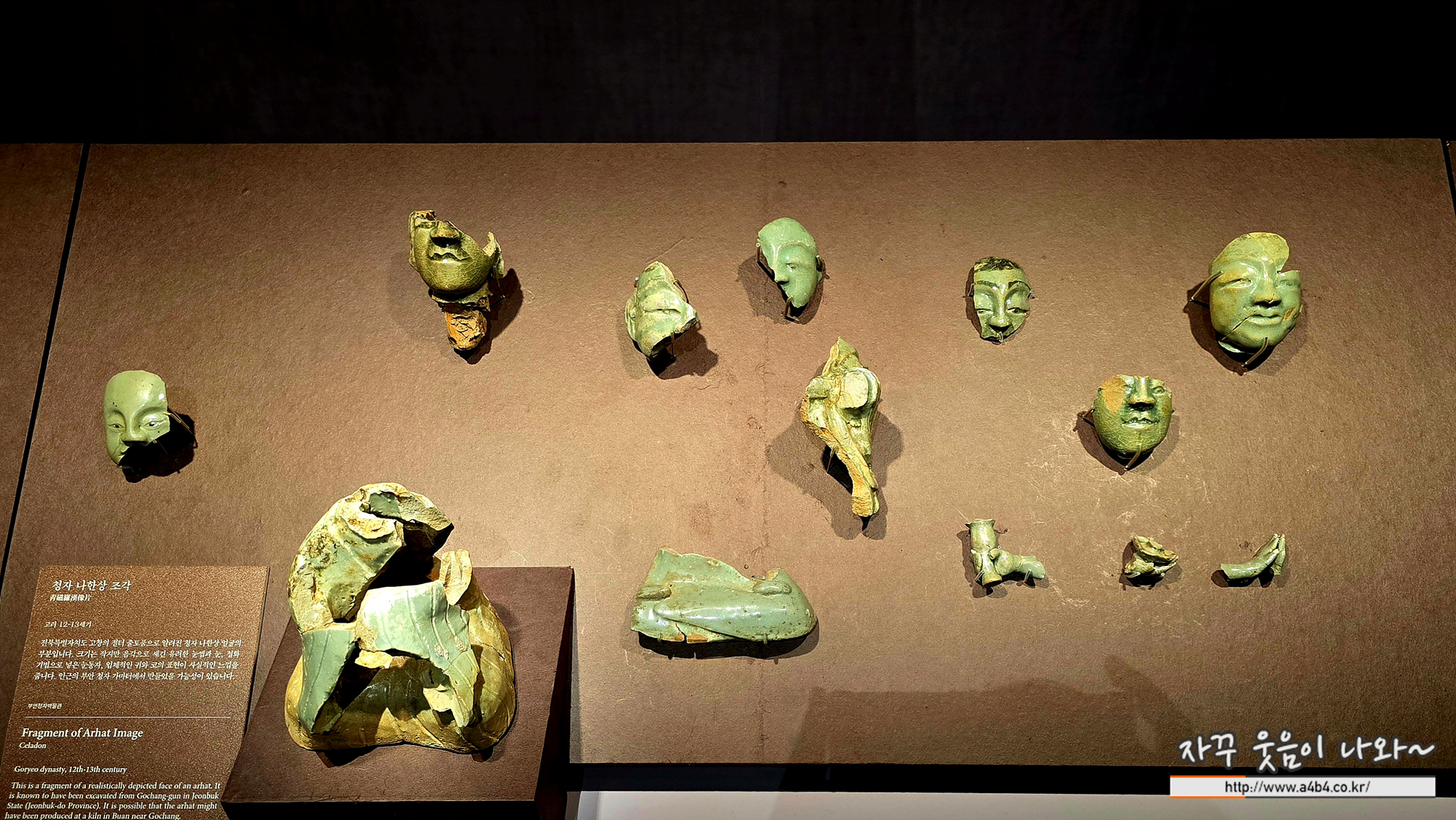 보살, 나한상 등 청자 불상 조각들이 전시되어 있습니다.