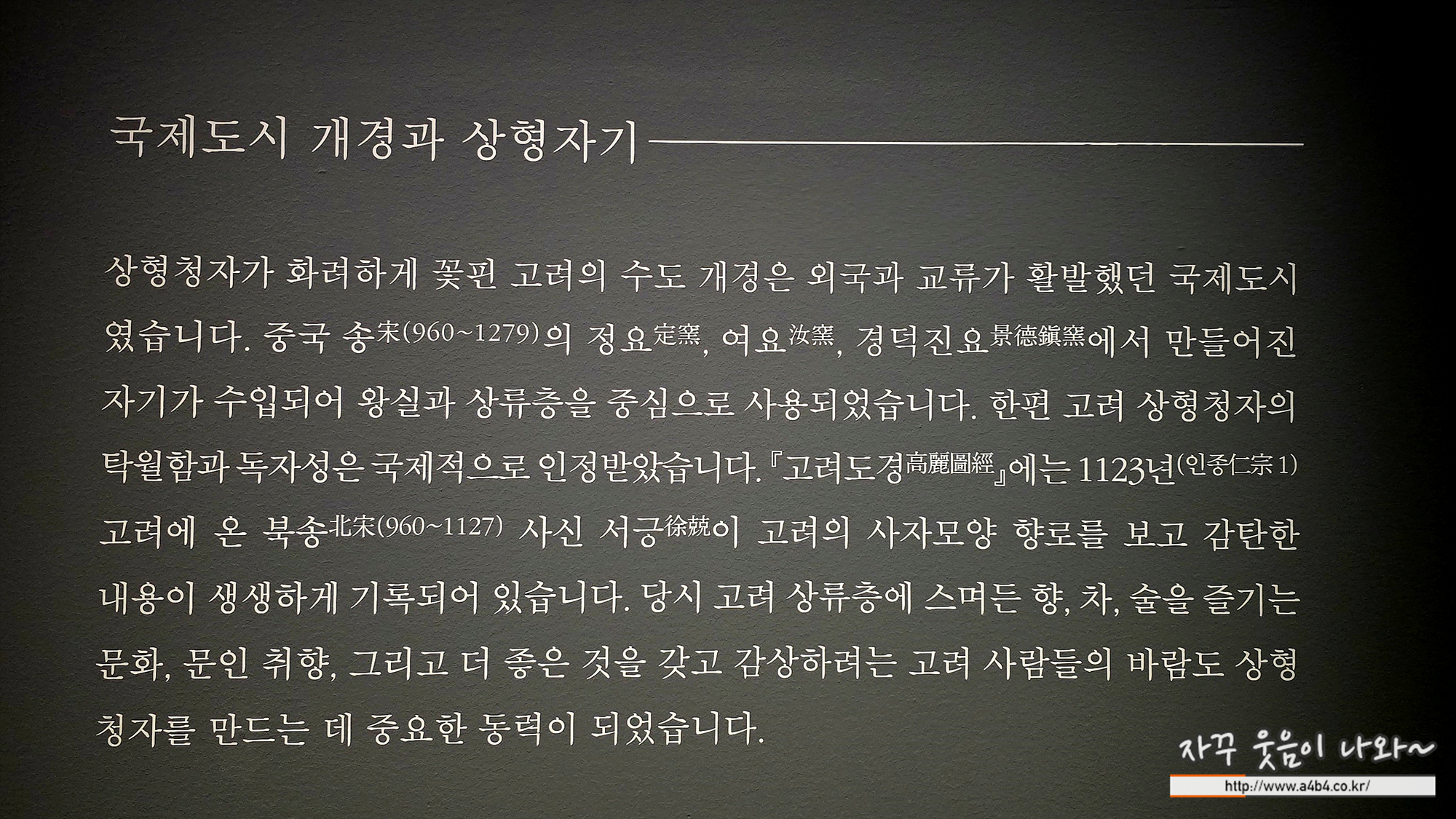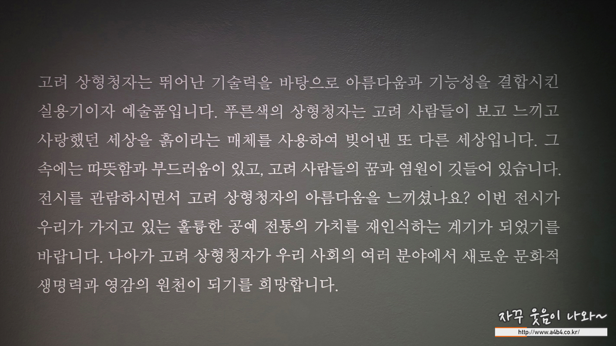 전시장 입구에는 한 점의 고려청자가 전시되어 있습니다.