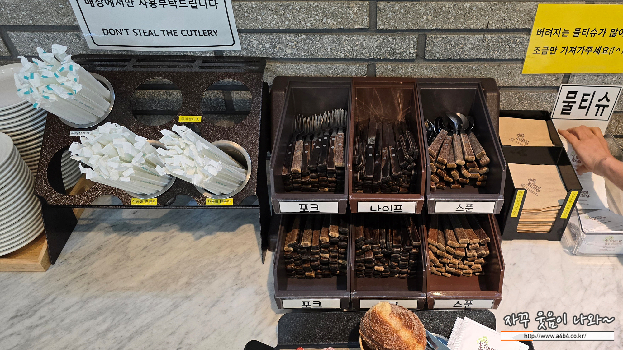 앞접시와 물티슈와,냅킨, 빨대, 포크, 나이프 등은 셀프로 챙기셔야 합니다. 식사가 끝나고 인천 송도 포레스트 아웃팅스 각 층에 있는 퇴식대에 식기와 쟁반을 반납해야 합니다.
