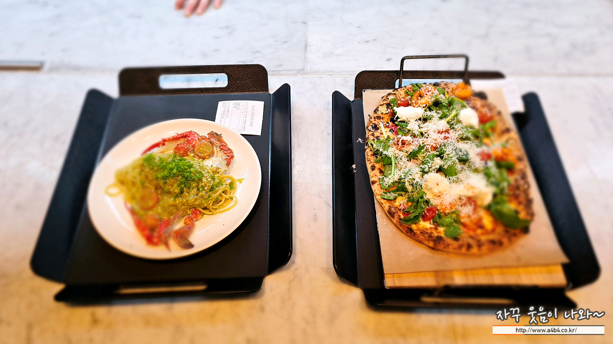 인천 송도 초대형 베이커리 카페 포레스트 아웃팅스 피자나 파스타 브런치를 주문하면 옆에 주방에서 대기하고 진동벨이 울리면 오시면 됩니다. 옆에 피클은 셀프로...