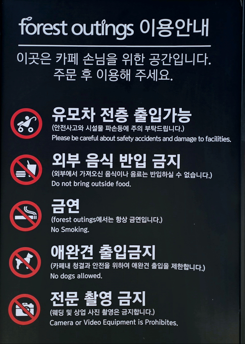 아쉽게도 송도 대형배이커리카페인 포레스트 아웃팅스 강아지 동반 금지입니다. 이 부분은 다소 아쉬운 부분이네요. 3층 정도는 반려동물과 함께할 수 있는 공간이 되었으면 좋겠네요. 웨딩사진 등 전문사진 촬영은 금지되어 있습니다.