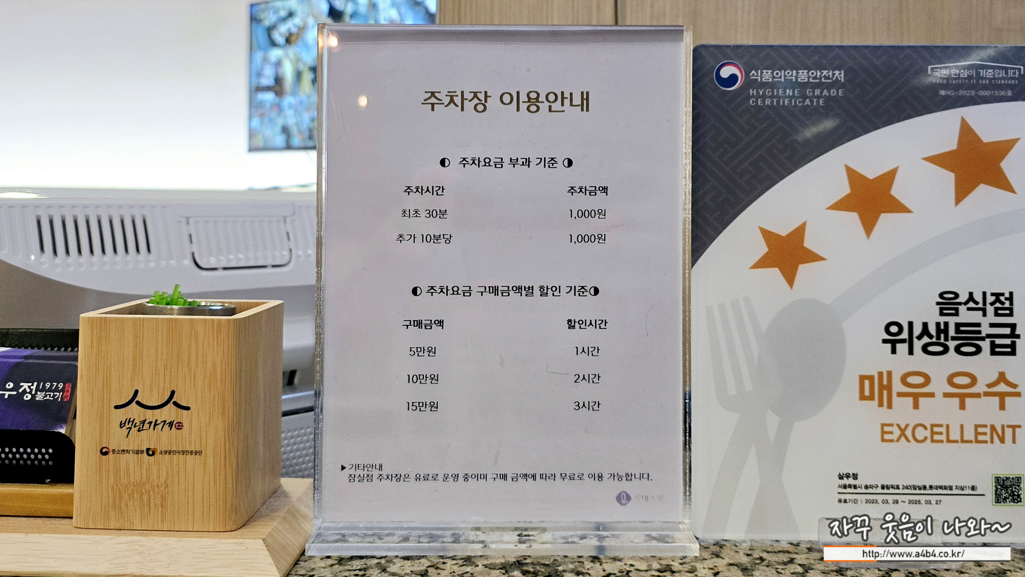 잠실 롯데백화점 맛집 삼우정 주차장은 롯데백화점 잠실점 주차장 이용하시면 됩니다. 롯데백화점 잠실점 주차요금은 최초 30분 1,000원, 이후 추가 10분당 1,000원 주차요금이 부과 됩니다. 첫 한시간 주차요금은 4,000원, 이후 한 시간 단위로 6,000원 주차요금 청구됩니다. 삼우정 주차요금 할인은 5만원 식사하면 1시간, 10만원 식사하면 2시간, 15만원 식사하면 3시간 무료주차처리 가능합니다.