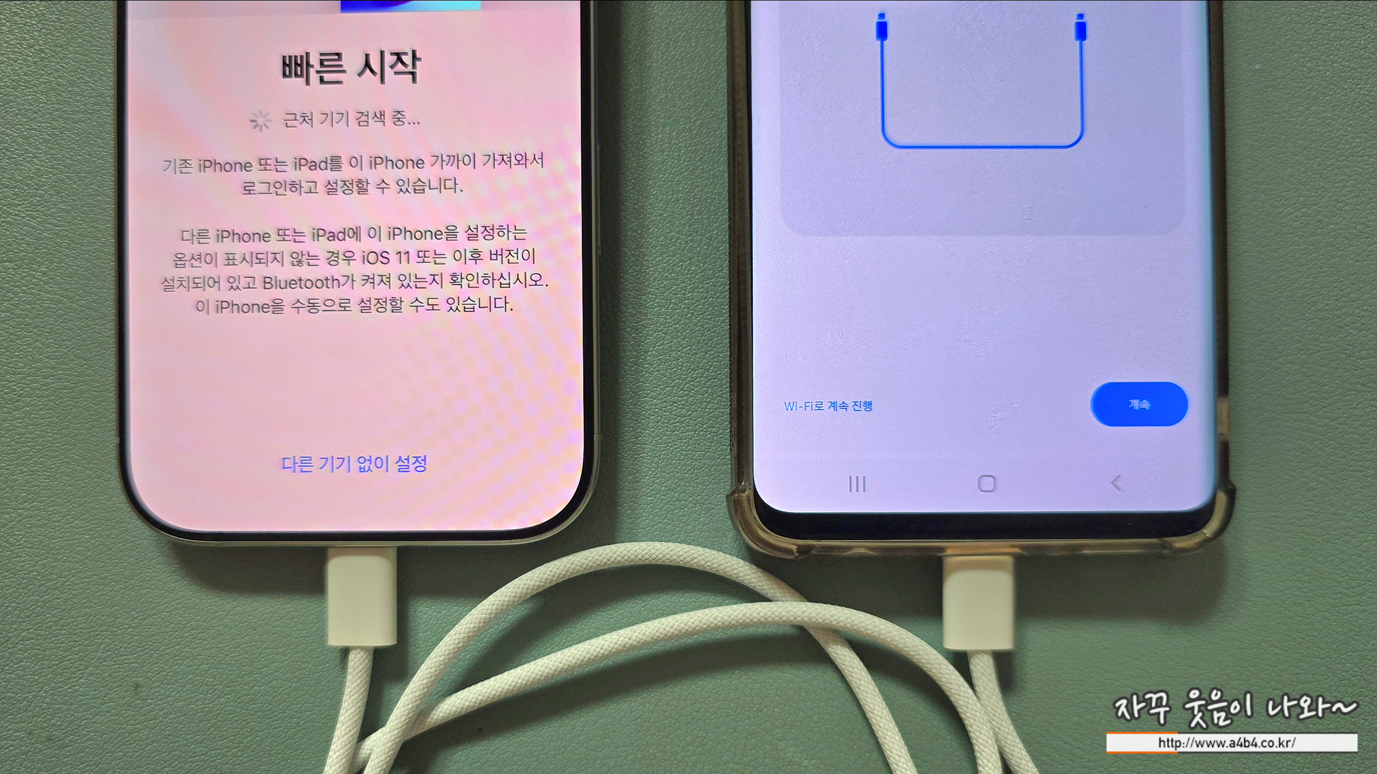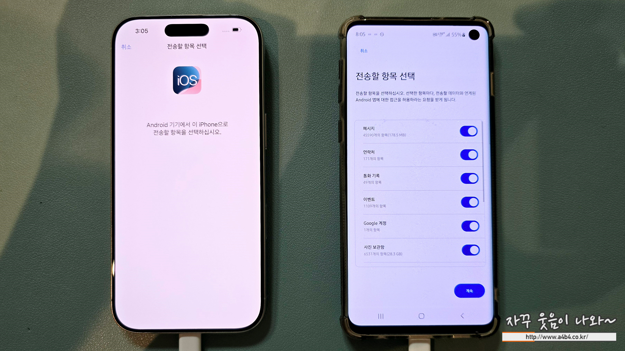 먼저 안드로이드 폰에서 iOS로 이동앱을 활성화 시키고 두 기기를 데이터 케이블로 열결해 줍니다.