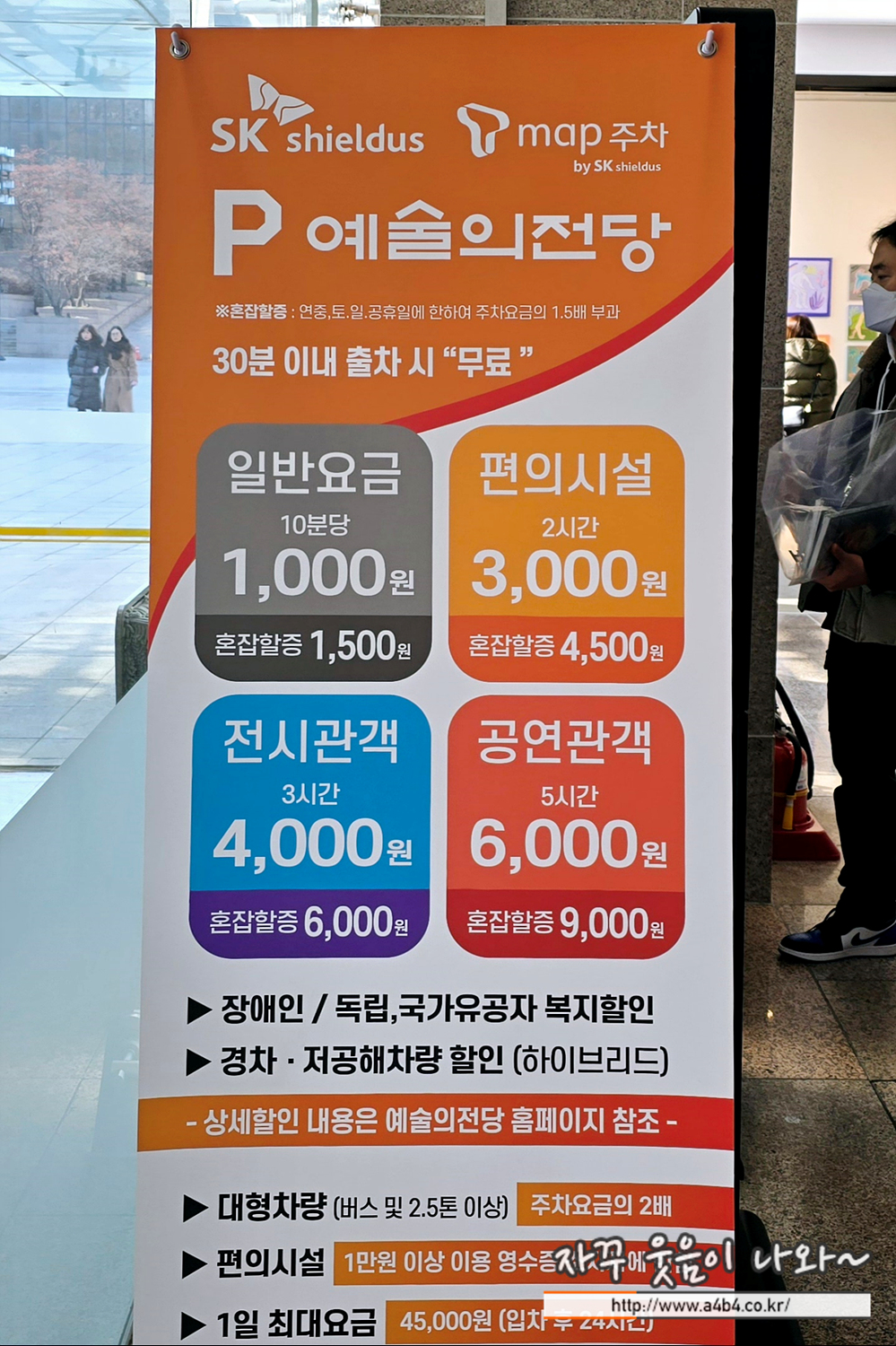 다만 전기차나 하이브리드 차량 등 친환경 차량의 경우 예술의전당 주차요금 중복주차는 지원되지 않고요. 본인에게 유리한 조건을 선택해야합니다. 주차 80분 미만 까지는 친환경차 주차요금 할인이 유리하고요. 80분~3시간 까지는 관람티켓 할인이 더 유리합니다.