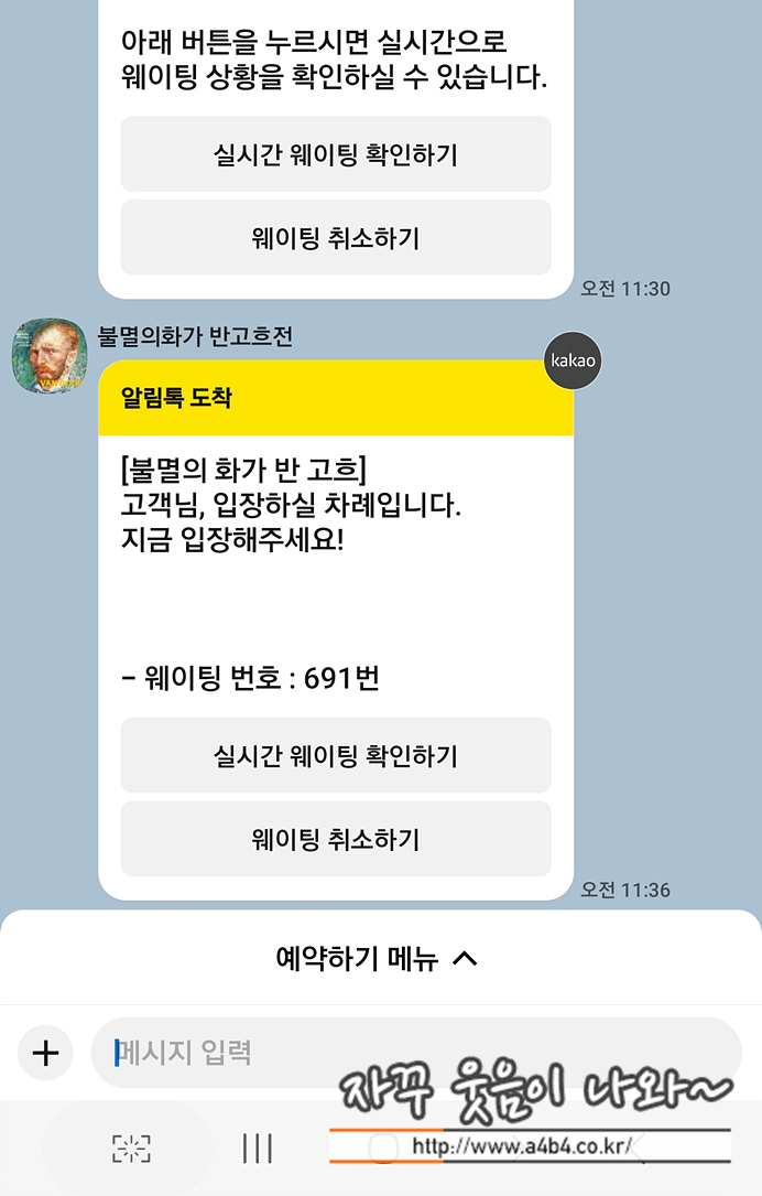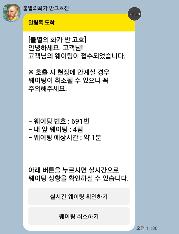 예전 전시회는 티켓팅하고 바로 전시회 입장을 위히 줄서기를 해야 했는데요. 앱을 이용해 식당 예약하듯이 대기번호를 받고 주변에서 기다리다가 입장 알림이 카카오톡으로 울리면 입장하는 편한 방식으로 변경되었습니다.
