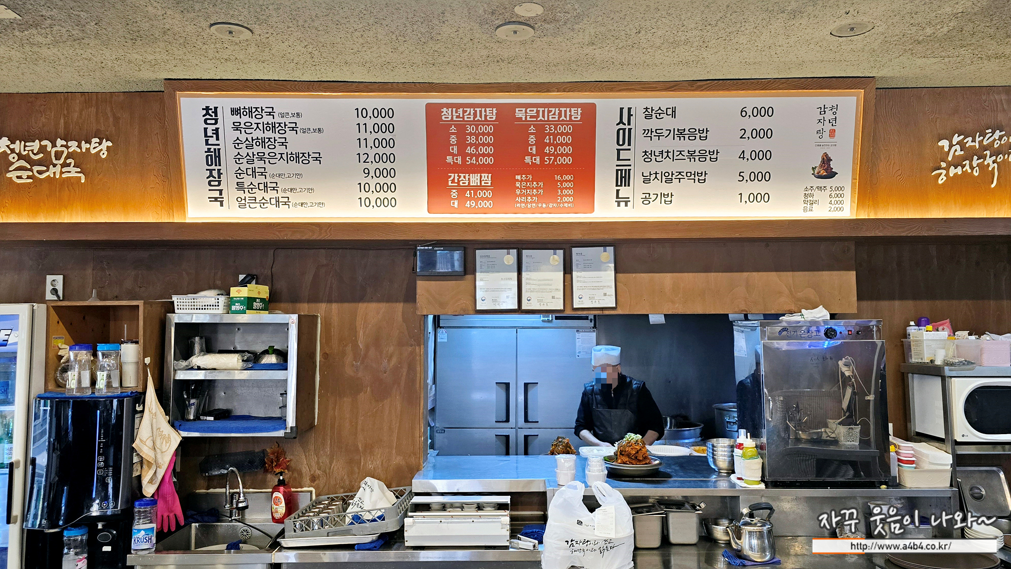 주방은 이렇게 공개되어 있고, 깨끗하게 유지되고 있습니다. 메뉴는 해장국과 감자탕, 묵은지감자탕이 있고요. 이외에 사이드메뉴가 준비되어 있습니다. 단품인 뼈해장국이나, 순대국 등의 식사 메뉴 가격은 1만원 전후, 감자탕은 소 중 대 특대 사이즈가 있는데요. 2인 메뉴인 소자는 30,000원, 3인 메뉴인 중 사이즈 가격은 38,000원 입니다.