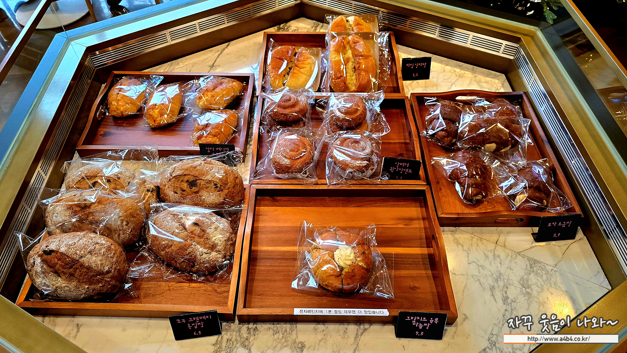 입구에는 일반적인 베이커리 빵 10여종이 준비되어 있습니다. 가격은 각각 5,000원 전후