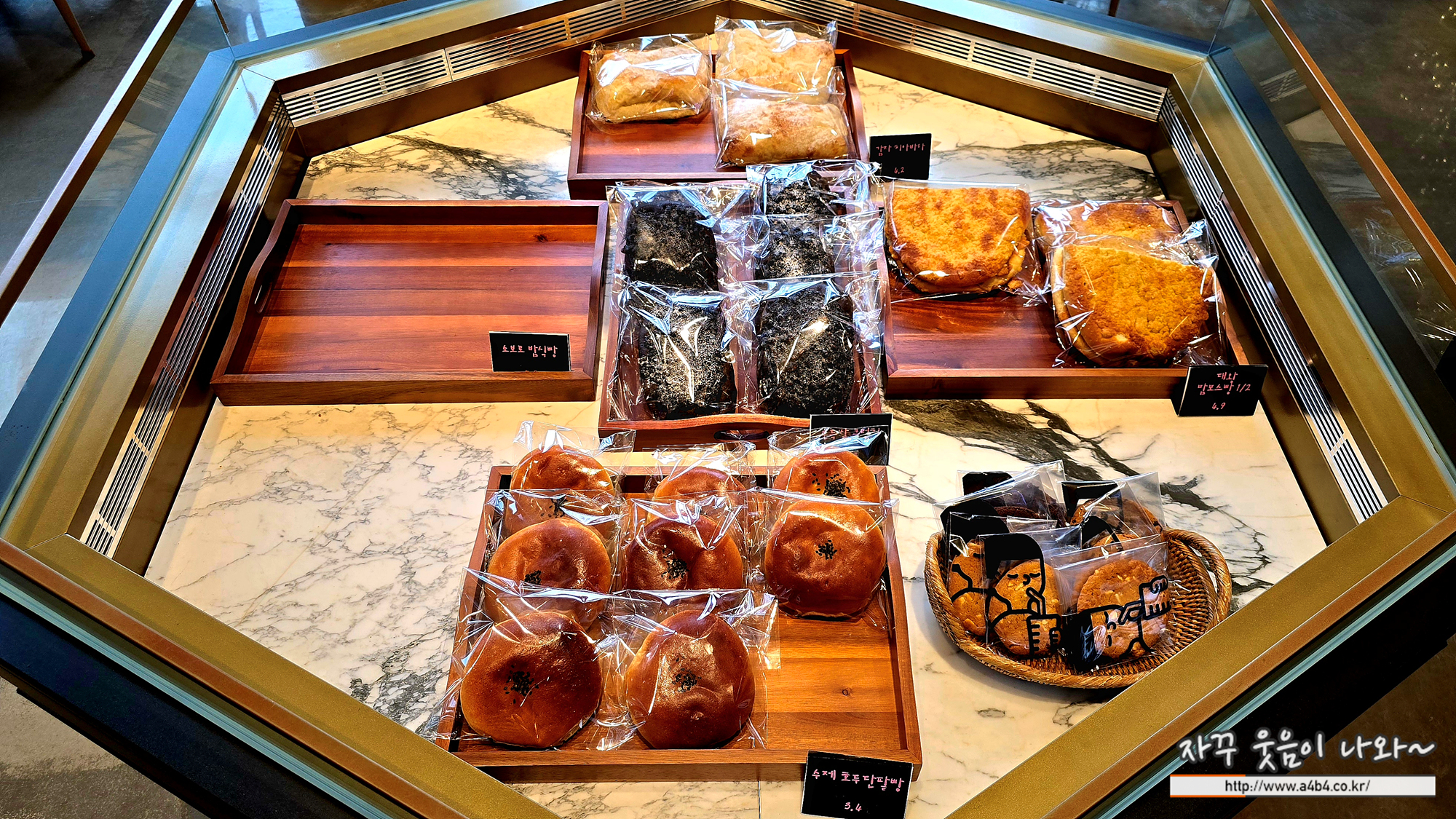 입구에는 일반적인 베이커리 빵 10여종이 준비되어 있습니다. 가격은 각각 5,000원 전후