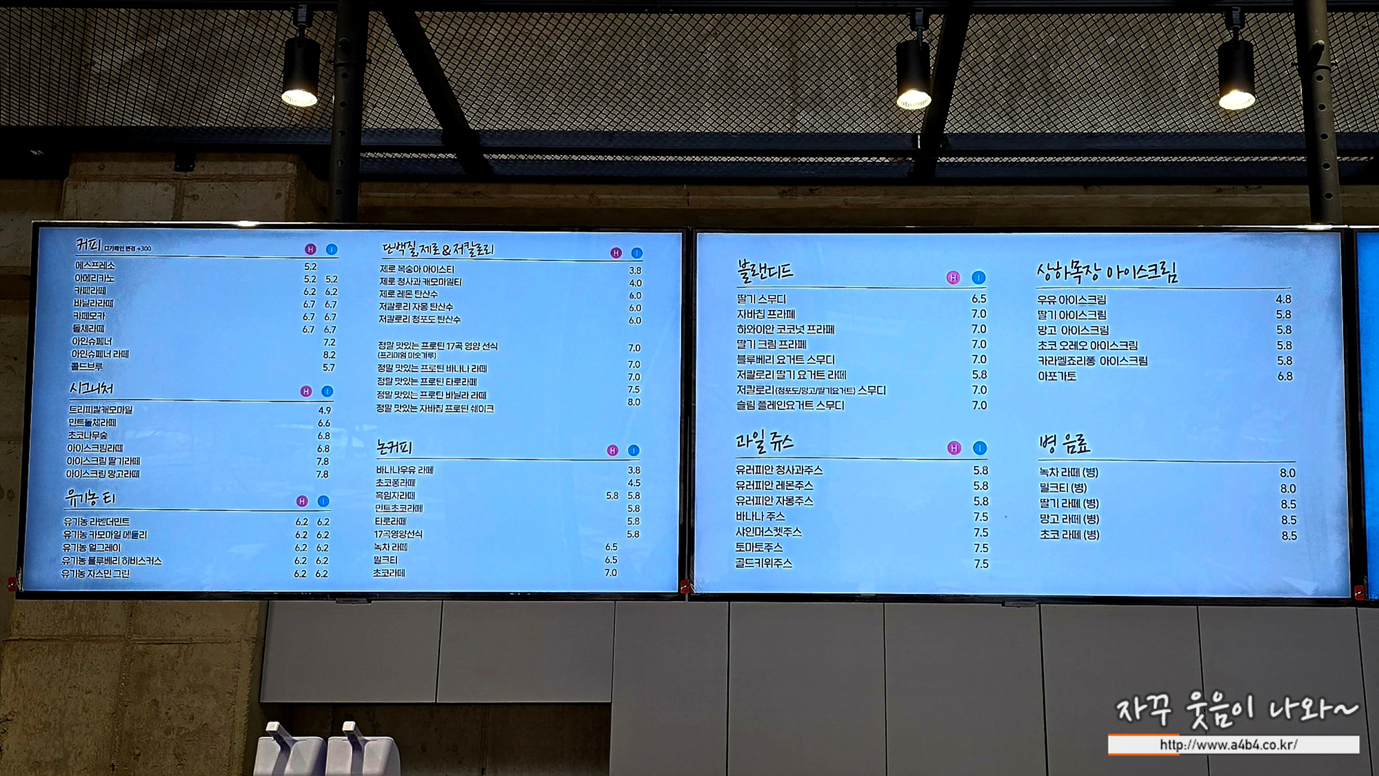 아메리카노 5,200원, 카페모카 6,700원, 라떼류 7,800원, 프라페/스무디 7,000원