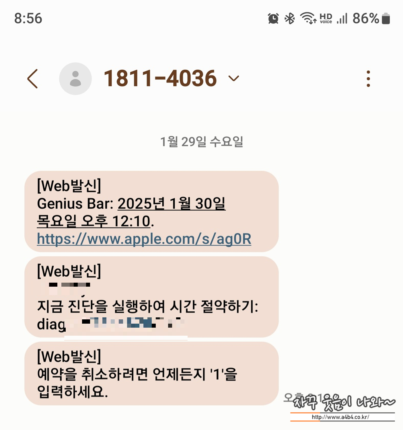 아이폰 수리 예약하고 받은 문자, 황당하게도 링크를 클릭하면 아이폰 영문 페이지로 이동한다.