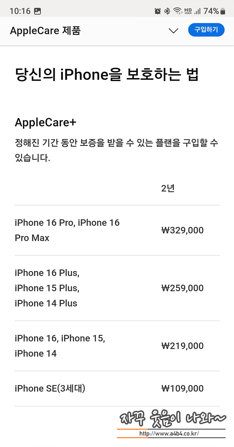 아이폰 16 프로 기준으로 애플케어플러스 가입비용은 329,000원이다. 우발적인 손상에 한정되며, 적용기간은 2년, 보장횟수는 무제한이다. 아직은 폰 관리가 쉽지 않은 나이여서 카카오휴대폰 보험 같은 횟수제한 있고 저렴한 보험 보다는 AppleCare+를 선택!